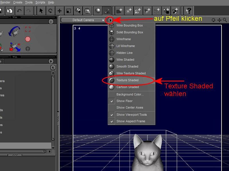 • über der Arbeitsfläche hast du einen Button, das steht Default Camera. Daneben ist ein schwarzes Dreieck. da klickst du drauf und wählst aus der Liste "Texture Shaded" . So wie es aussieht ist Solid Bounding Box eingestellt. Unter der Einstellung "Texture Shaded" sollte die Katze dann texturiert sein.