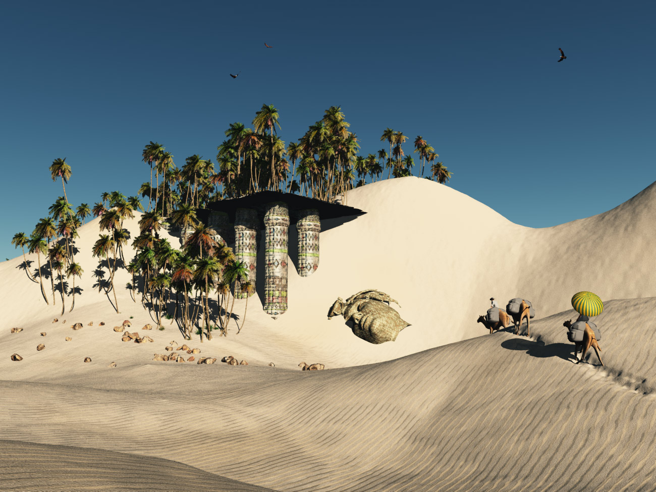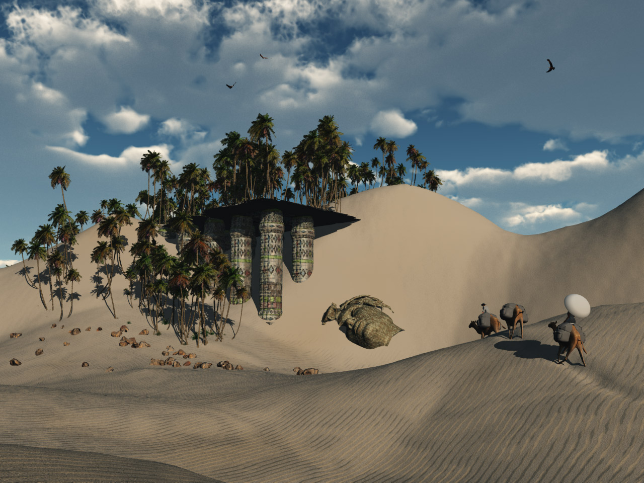 Landschaft, Pflanzen und Abschlussrendering mit Vue 6 inf. Die Personen und Kamele wurden aus Poser 5 importiert, die Kamellasten stammen von contentparadise. Der Tempel ist mit Cinema 4 D 6 und Vue 6 inf gebastelt, die Säulen wurden mit einer selbstgemachten Textur versehen.