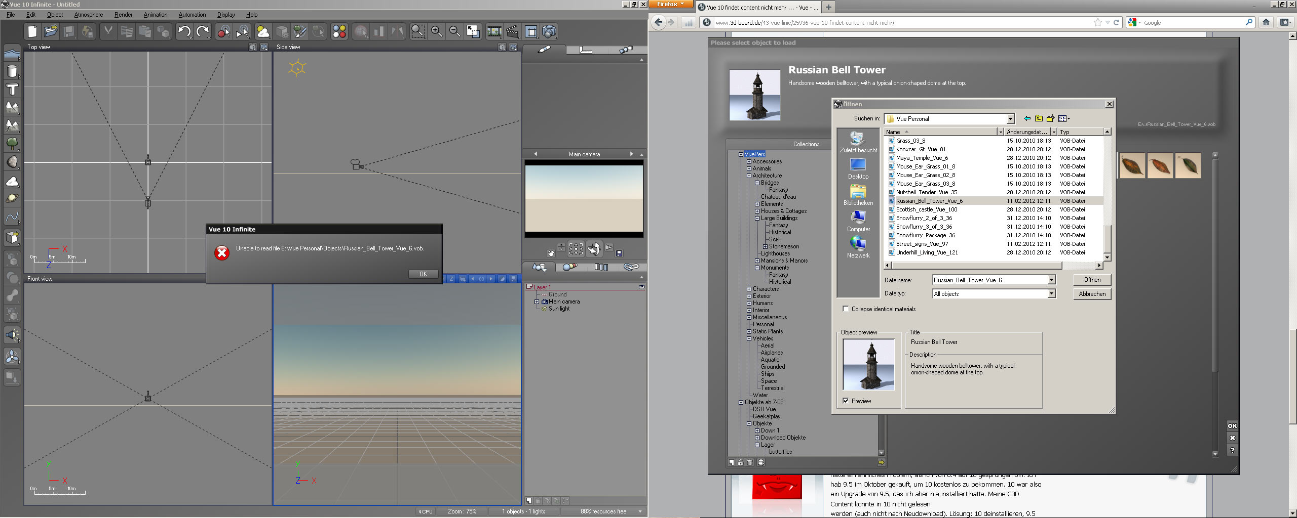 1. Vue 8.5 und 9.5 können, 10 und 10.5 können nicht die jeweils gleiche Datei laden. Eine "Problem"-Datei (Russian Belltower) habe ich neu von c3d gedownloaded und diese DAtei funxt in 10 und 10.5 . Von den erkennbaren Merkmalen sehe ich allerdings keinen Unterschied zwischen den Dateien (Anhang 2). DAraus ergibt sich: Alles nochmal downloaden !