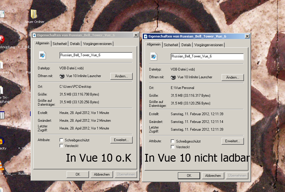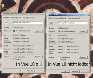 HAbe mich nochmal drangesetzt und eines der abgelehnten Objekte(Russian BellTower) nochmal von c3d runtergeladen und: oh Wunder - es geht! Allerdings: Die Datei hat die gleichen Eigenschaften, Namen etc. wie die , die Vue 8.5 oder 9.5 inf geöffnet und von Vue 10/!0.5 abgelehnt wird. Siehe dazu die Anhänge. Was ist da los ?