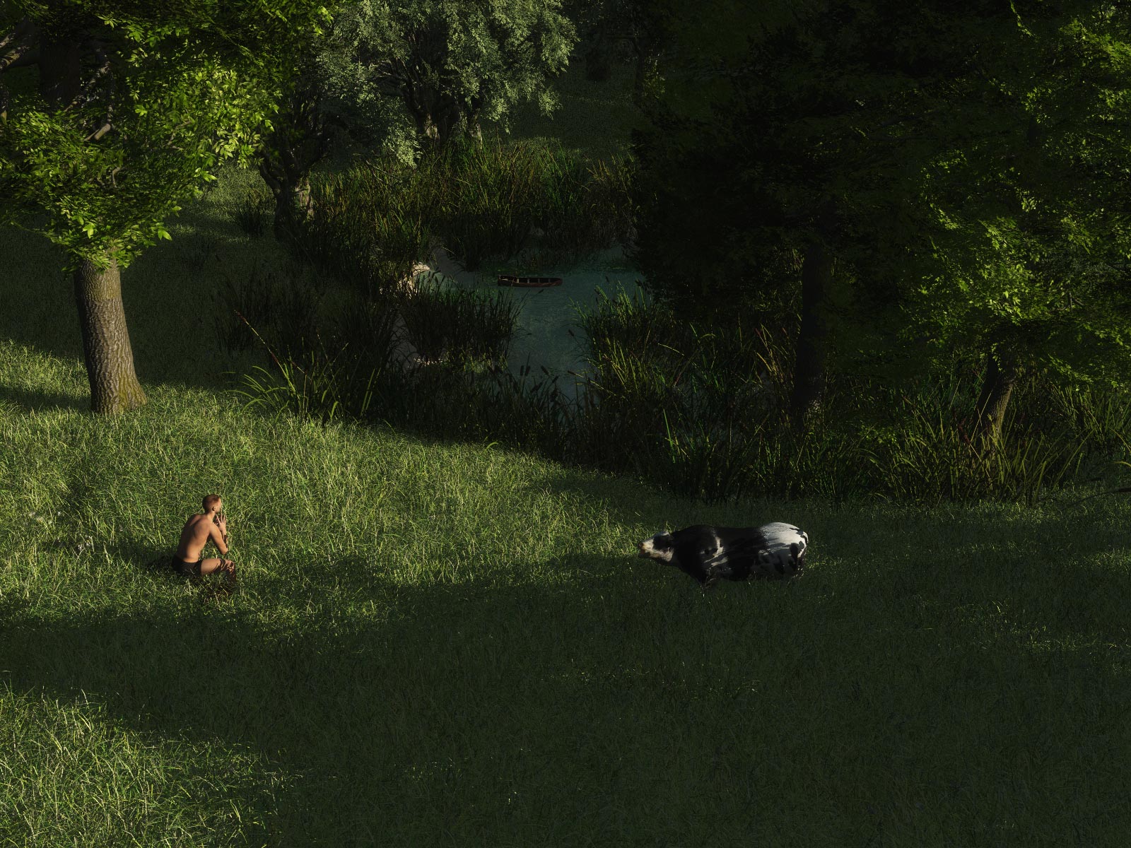 Das Einzige was mich irritiert ist die Sitzposition des Mannes. Vom Terrain müßte es gleichmäßig abschüssig sein; oder sitzt er auf einen überwucherten Stein/Holzbank?