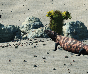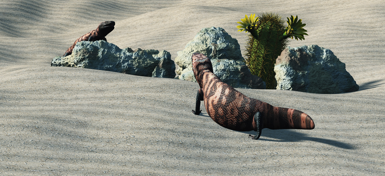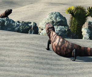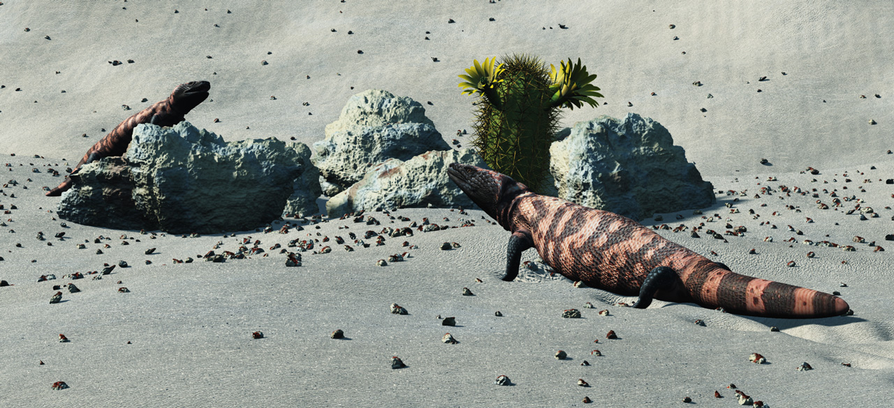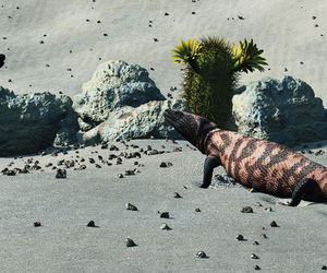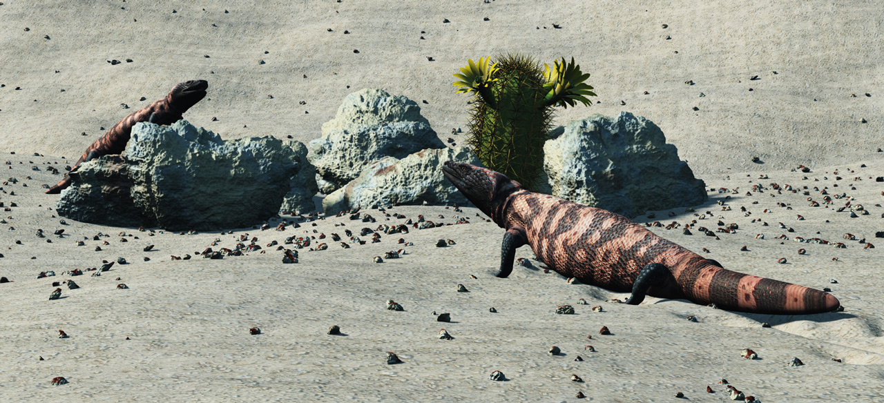 Bei dem Bild habe ich mit den bekanntermassen eher bescheidenen Vue-Steinen und Texturen experimentiert. Das Ergebnis find ich passabel. Es sind "normale" Vuesteine mit der "2 lichens desert"Textur, bei der ich ein bißchen an den Bumps und der Skalierung gedreht und displacement-mapping aktiviert habe. Renderzeit ca. 15 Min. mit externem Renderer. Der interne wollte nicht mit Verweis auf zuwenig Speicherplatz ... ... Da können aber auch die grossen Texturen der Gila-Echsen und des Kaktus (alle von CP) eine Rolle gespielt haben. Das Displacement hat ihm dann wahrscheinlich den Rest gegeben.