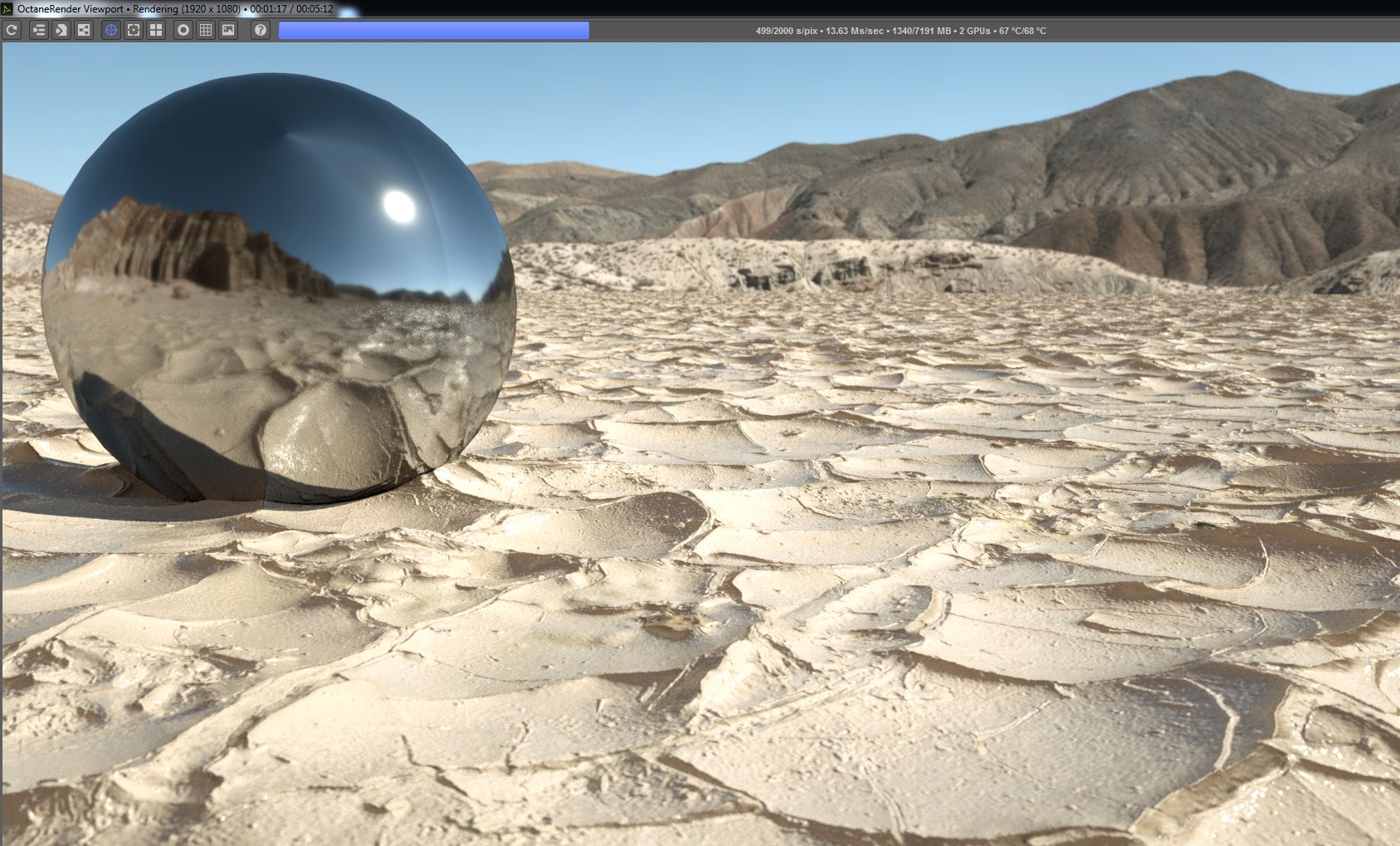 Zur Ergänzung, den direkten Vergleich (zu den Octane Rendern oben) hatte ich ja vergessen, also die Displ. Textur des Bodens (1 Face) einfach auf die Kugel (400 Faces) zu kopieren.