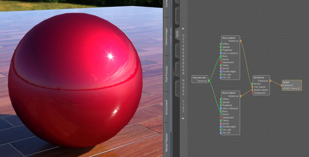 Weil man in Octane jede Textur via drag and drop auf jedes beliebige Objekt ziehen kann, ist das in einem Sekundenbruchteil erledigt. Dass die Kugel Textur nun so völlig anders aussieht als der Boden,