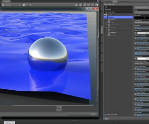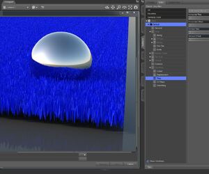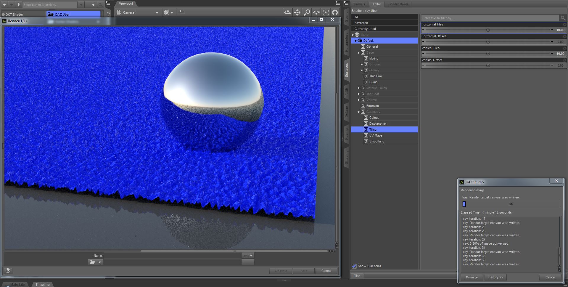Eine 20x20m Plane (1 [lexicon]Polygon[/lexicon]) in die Szene gelegt, iRay Uber drauf gepackt, blau angemalt und dann aus den DS iRay Grundtexturen die Leder Normal Map in den Displ. Kanal gesteckt.