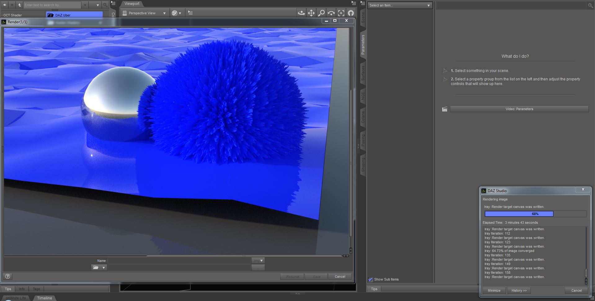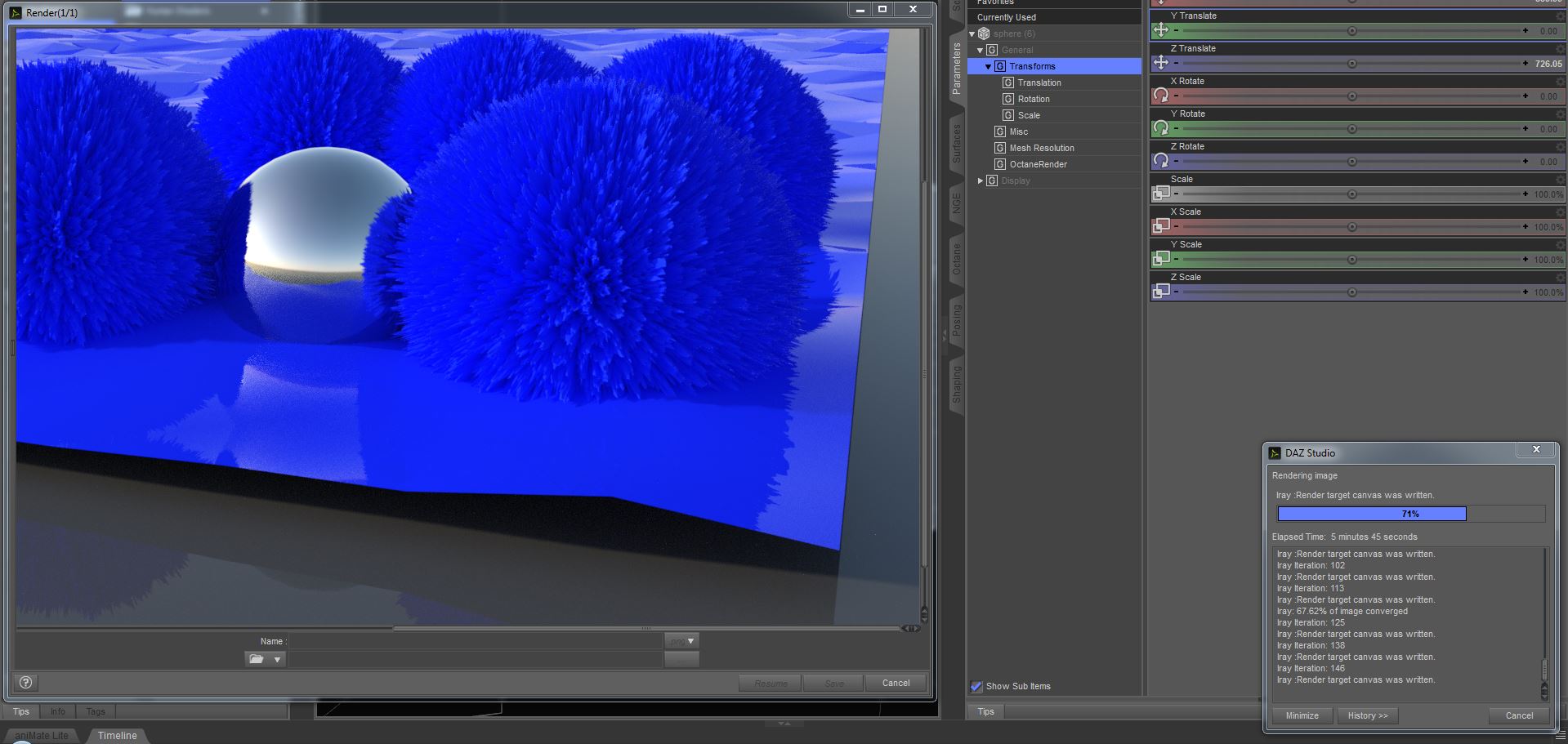 Doch auch hier, obschon ja nun zwei bzw. fünf(!) ge-diplace-te Objekte im Raum sind, differiert die Renderzeit nur marginal. Das tut es natürlich auch bei Octane. Nur sind es dort halt Sekunden, in iRay sind's Minuten.Hier die zu den Octane Rendern vergleichbare Basis Situation...