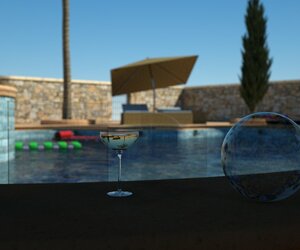 Die Gläser sehen immer "falscher" aus und bei Bild 150 klebt sogar der Champagner am oberen Glasrand. Und zwar nur durch den falschen Brechungsindex des Glases.