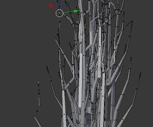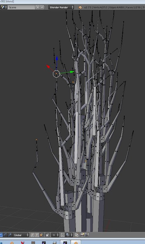 Symetrische Objekte, wie das weiter oben gezeigte Gebäude sind - selbst bei höherer Komplexität - ein Klacks, da man beim extrudieren meist auf einer Geraden bleibt. Bei diesen "blöden Ästen" hingegen, ein langwieriger Eiertanz. Zum einen, weil ich teilweise mit dem View/Zoom nicht dicht genug ran kam, in der Folge das Ast-Objekt hochskalierte, was mir dann wiederum die Größenrelation nahm. Bei der nächsten Arbeit dieser Ar, werde ich sinnvoller Weise die ganze Szene hochskalieren, wenn ich an irgendwelche Fisselsenden sehr nah ran muss.
