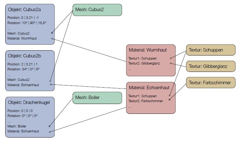 [lexicon]Mesh[/lexicon] => Material(zuweisung) => (ggf.)UV-Map => Textur => fertiges Objekt.