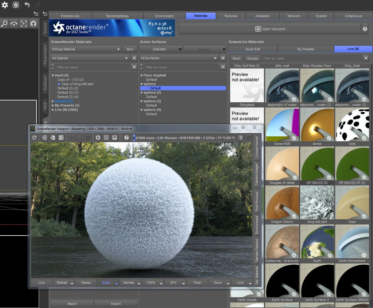 Dies kann ich manuell tun, unter Octane Render Materials (2) oder in den Scene Surfaces (3), oder aber - und damit intuitiv - direkt via Mausklick in den offenen Rend View.