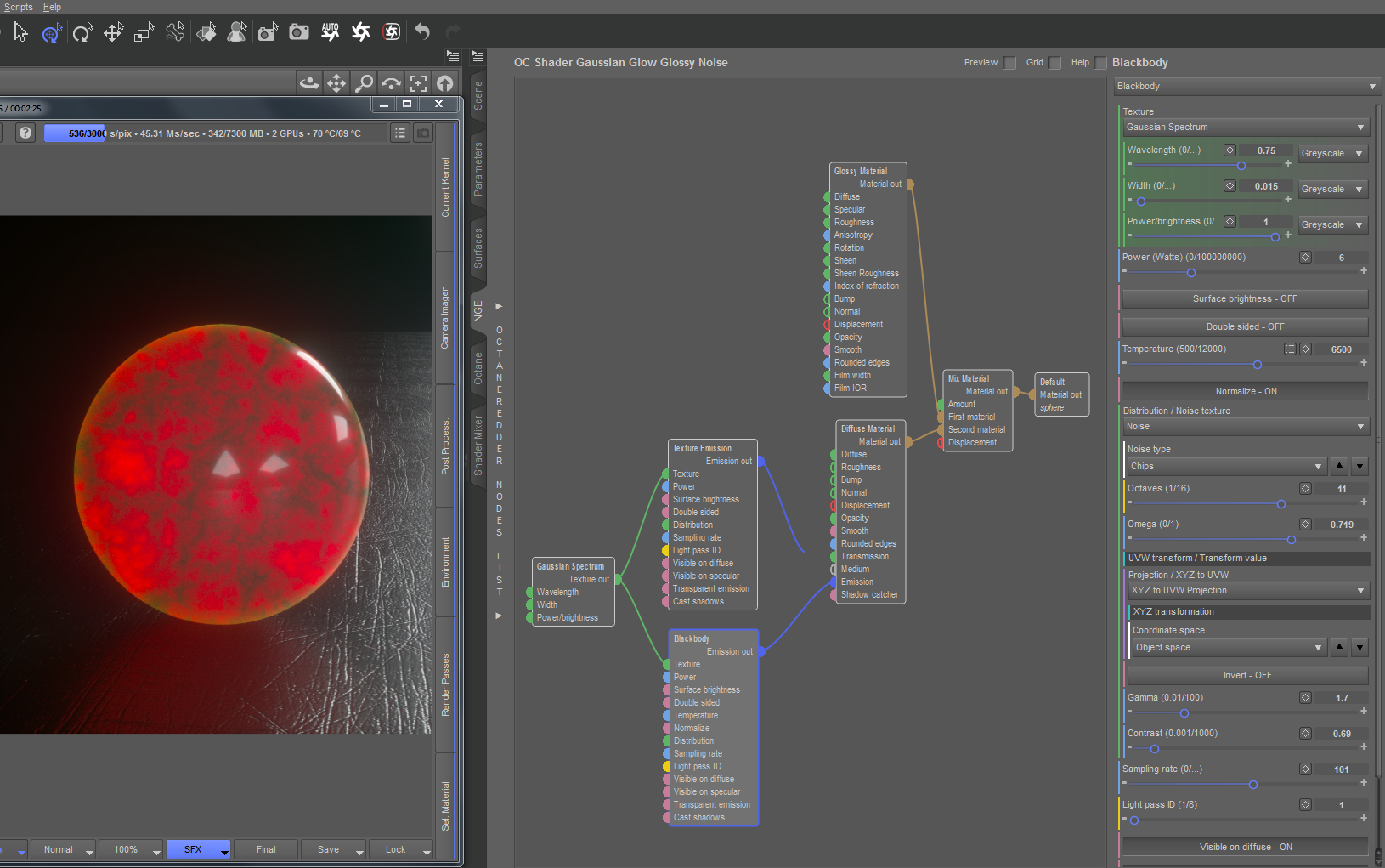 Hier die oben angesprochene Kombi Diffuse/Glossy, erweitert um Emission, Gaussian, Fresnel (Iray = Coating / Octane = sheen) und Noise.