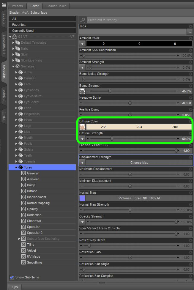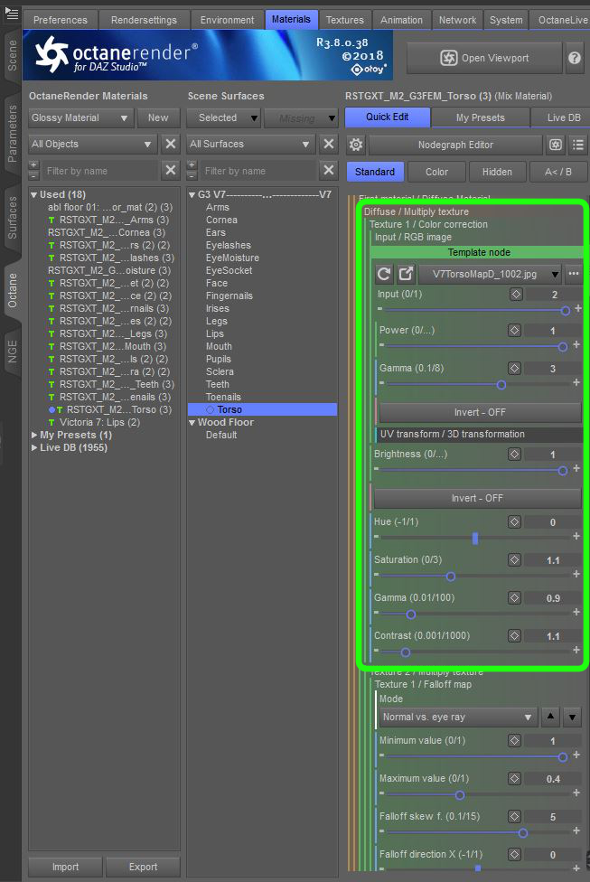 die ich hier auch verstellen musste (z.B. Colour und Gamma) damit die Textur optisch