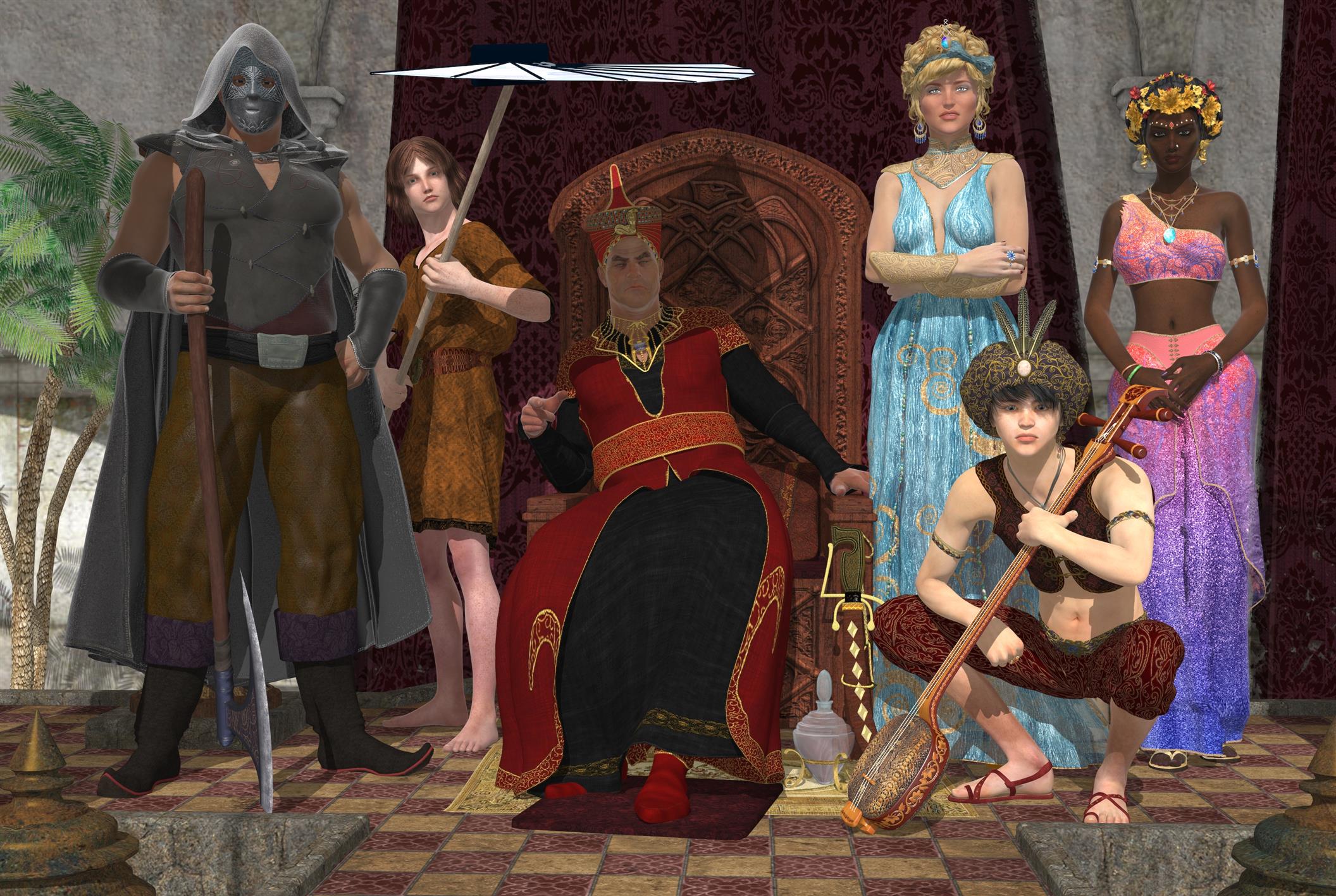 @ Roadrunner: das setzt aber ein gewisses gesundes Selbstvertrauen voraus. Gut, wenn man es hat. Man sieht ja auch viele Bilder von anderen, wenn der eigene Geschmack vom Mainstream abweicht, fragt man sich schon, ob an seinen Bildern was nicht stimmt. Z.B. die von esha in gewisser Weise zu recht kritisierte sehr weiße, überbelichtete Haut der Favoritin rechts neben dem Thron. Mir kam es auf das Glänzen der schweißnassen Haut einiger Figuren in der grellen Sonne an, daher habe ich Glossiness und Specular Strength in DAZ Studio plus die Glossiness in Reality 2.5 sehr hoch gedreht. Das erzeugt eben teilweise ein unklares gleißendes Bild wie bei einer Spiegelung. Wenn man auf protraitartige, klare Haut Wert legt, ist so was von Übel, ich nehme es in Kauf.