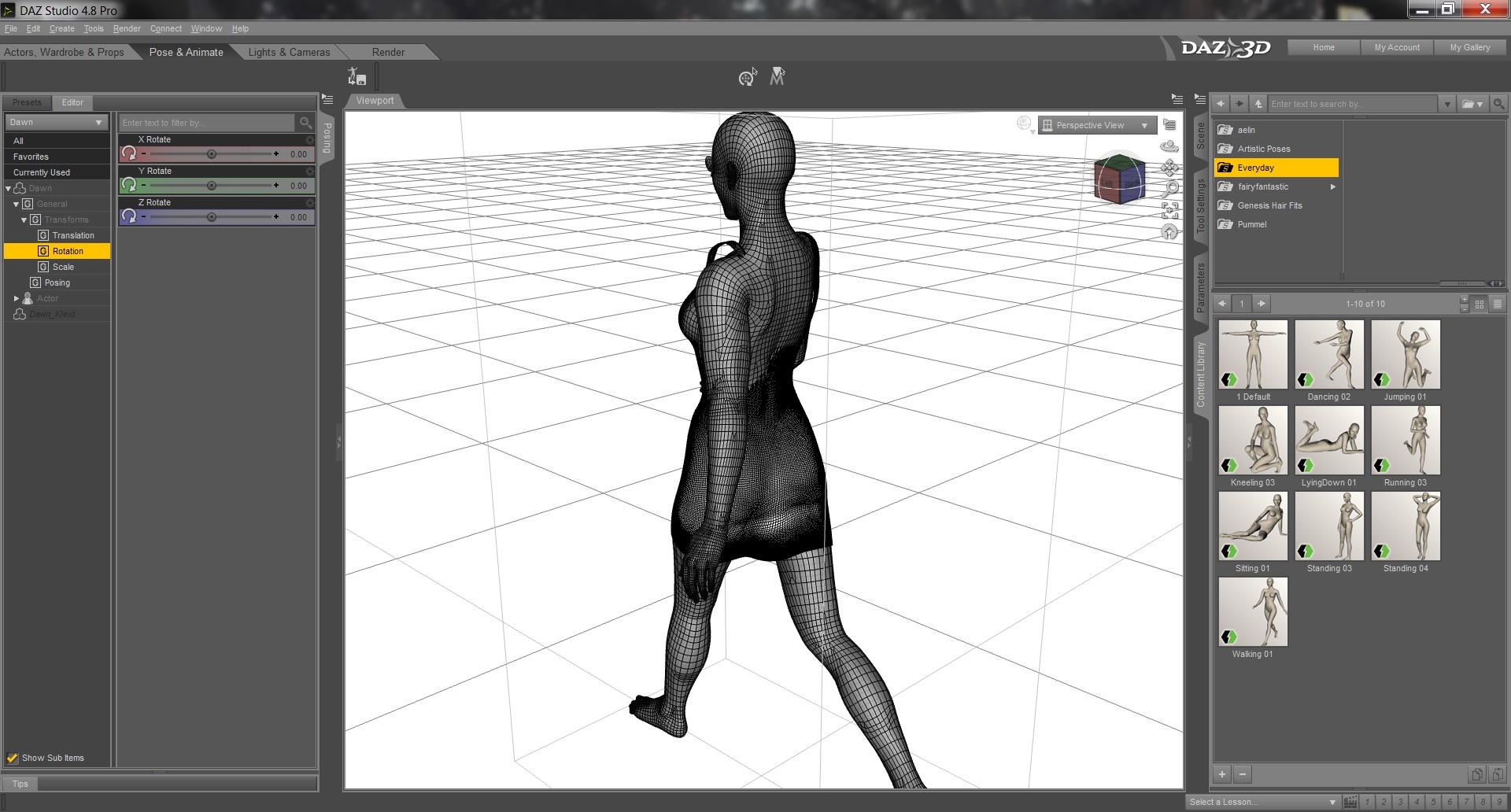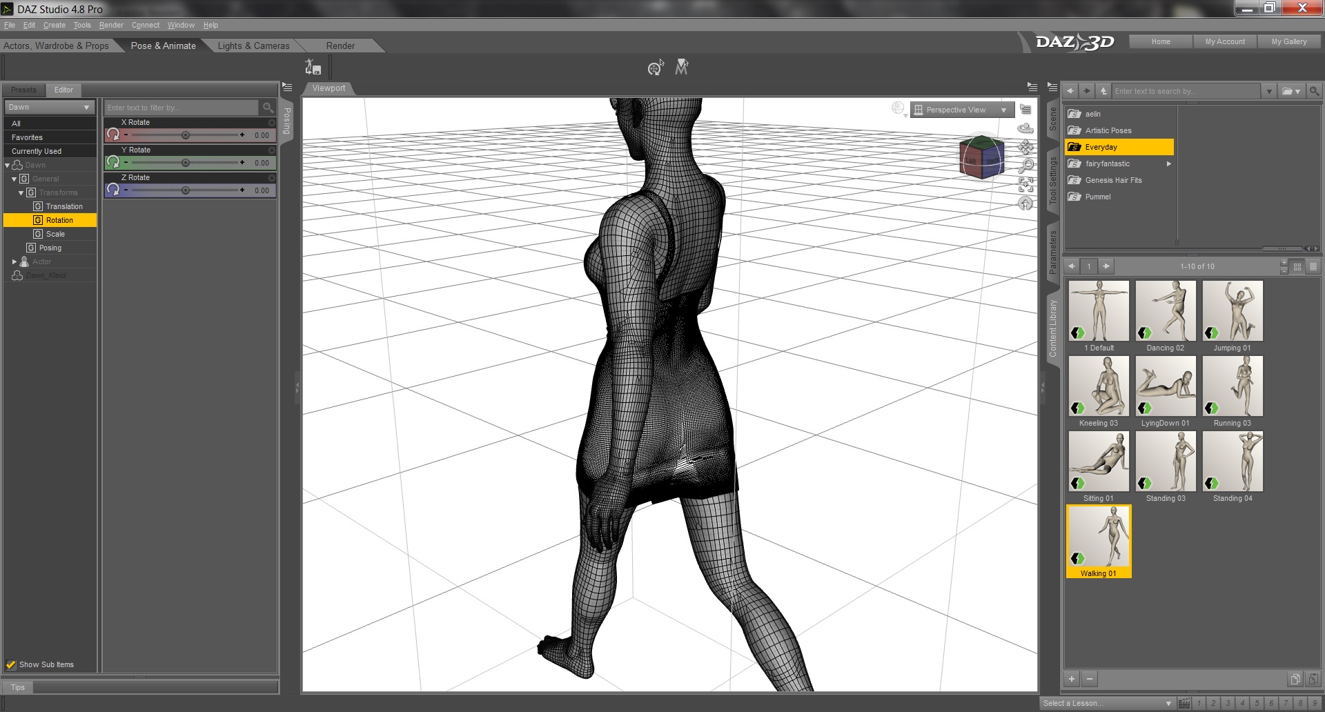 Also, schönes Kleid in Blender an die Dawn angepasst, als obj in DAZ (4.8 pro) rein, und mit dem Tranfer Ulility der Dawn übergezogen (ist das dann riggen?). Bei default pose alles super. Klar, ist ja auch einfach.