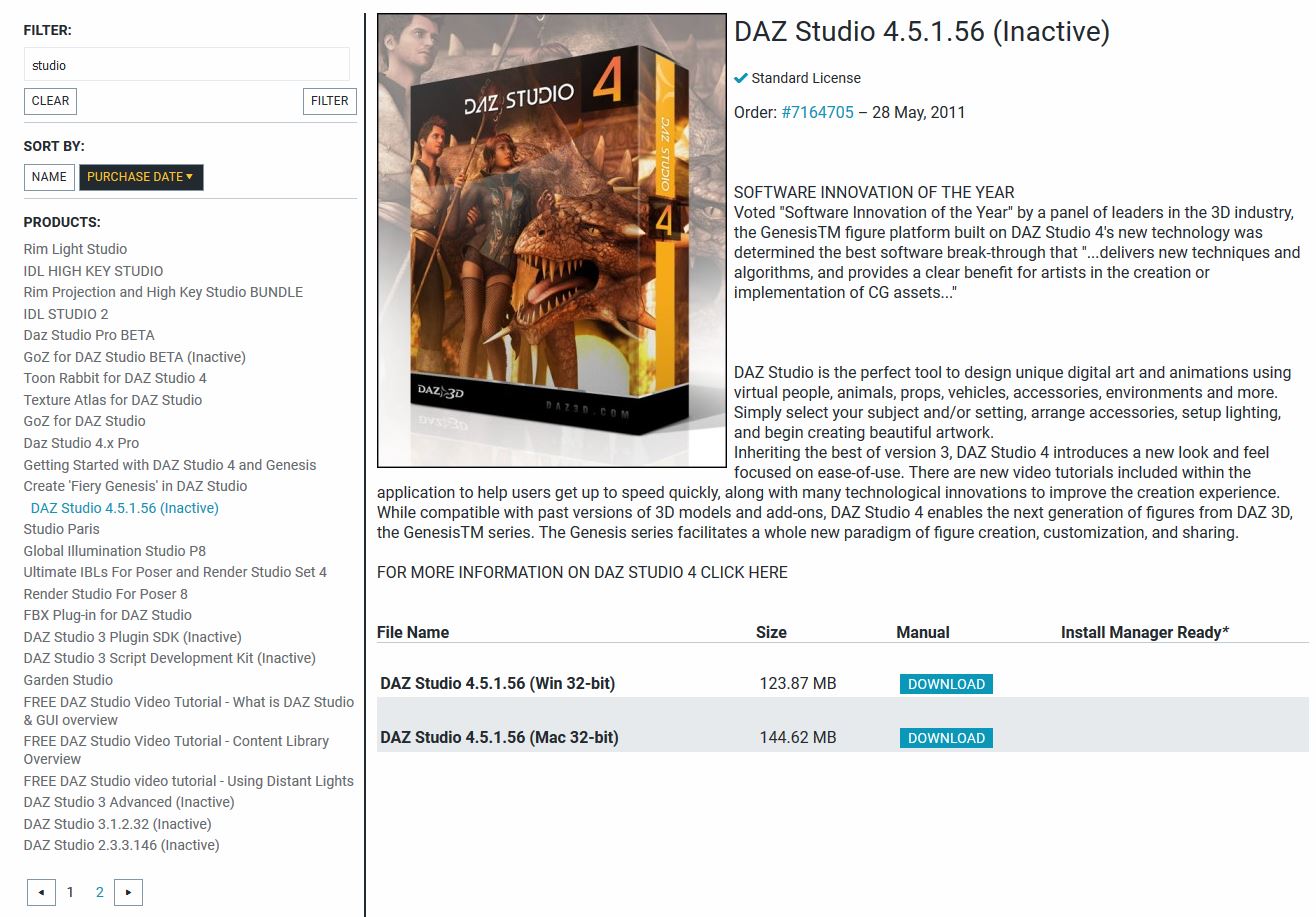 Der DIM war auf meinem alten Rechner ... aber den hab ich ja geschafft ... oder der mich - je nach dem wie man es sehen will ... Hab die Studio Verisonen auch nie über den DIM installiert immer nur handisch. Also unter Studio finde ich wenigstens die Daz Studio Version 4.5, die eigentlich inaktiv sein sollte zum Download ... nur falls die jemand benötigen sollte nachträglich aber mit der Selektion 'DAZ Studio 4.x Pro' werd ich fündig! Das schreib ich mir für die nächste Ausgabe gleich mal auf, bevor ich es wieder vergesse! Ich danke Euch recht herzlich!