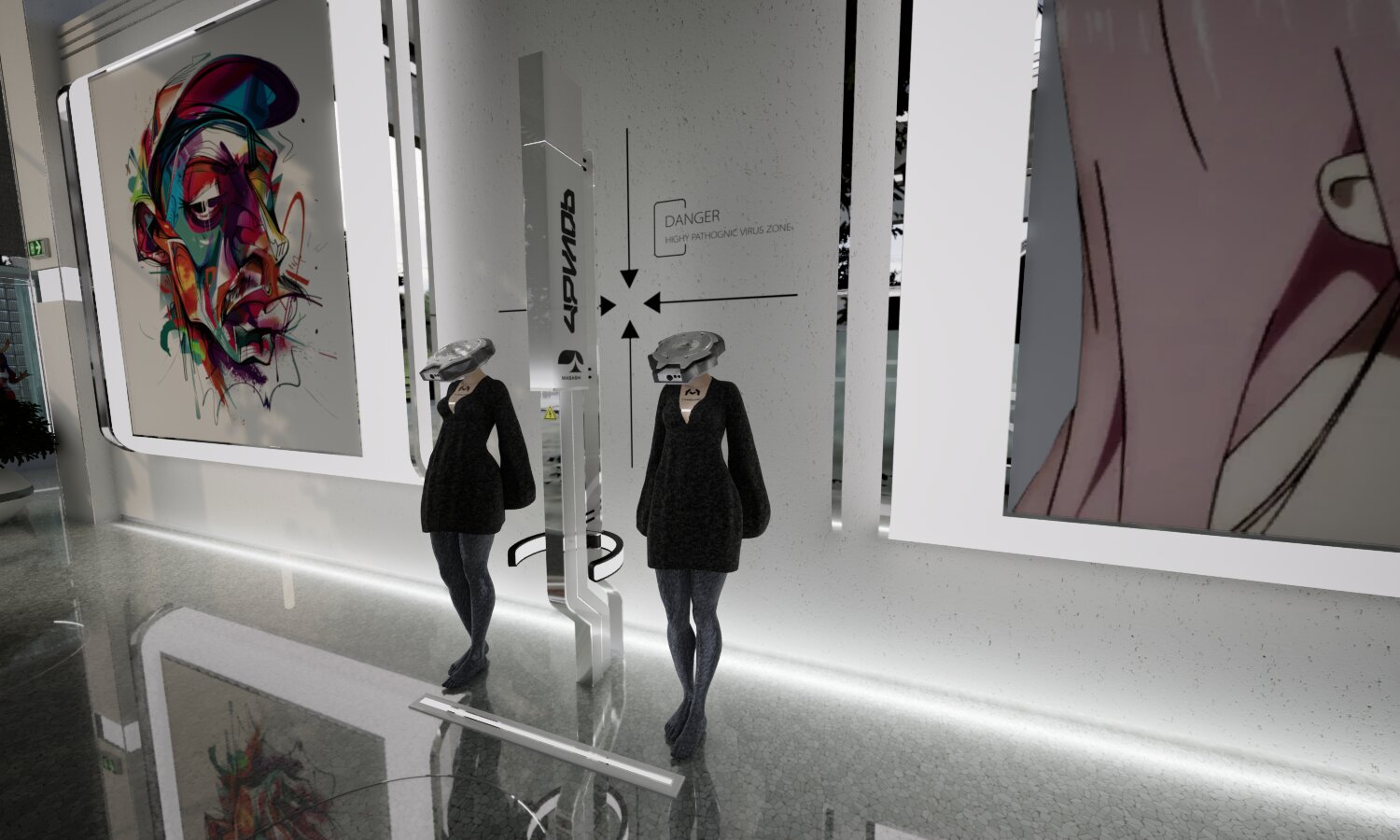 Diese Installation zeigt einen Replikator im Kontext eines VR-Museums. Drei Tische bilden ein geschlossenes System: Zwei davon sind aktiv und mit vertikalen Syntheseröhren verbunden, der dritte fungiert als Referenz- und Kontrollstation.