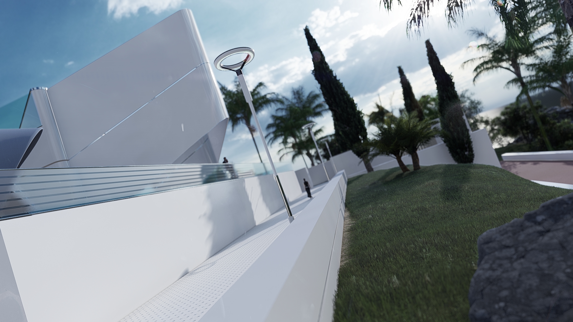 Die Form besteht aus einem Dreieck, die obere Etage ist eine überdachte Glastrasse.