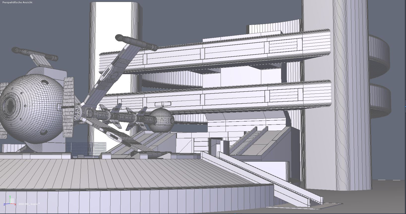 Feinheiten werden noch ausgebessert, die Heckkugel angefertigt, kleinere Fehler korrigiert und die Signallichter platziert. Anschließend folgt ein Testrendering – zunächst im Skizzenmodus. Die Kacheln an der Kugel sind vorhanden, nur sieht man sie sehr schlecht, später werden sie sichtbar.