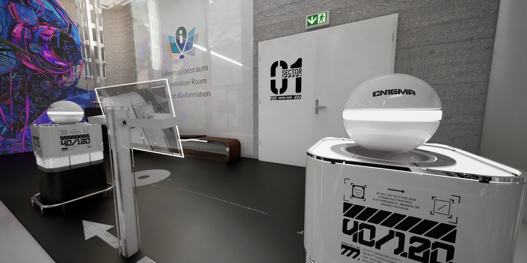 Die Teleporter tragen den Namen Enigma, in Anlehnung an die historische Chiffriermaschine. Beim Teleportationsvorgang werden die zugrunde liegenden Bits verschlüsselt, fragmentiert und erst am Zielpunkt wieder korrekt zusammengesetzt. Dadurch ist der Prozess nach außen nicht lesbar und vor Manipulation geschützt. Diese kontrollierte Verschlüsselung stellt sicher, dass keine unerwarteten oder „bösen“ Überraschungen auftreten, sondern die Übertragung zuverlässig und unverändert erfolgt.