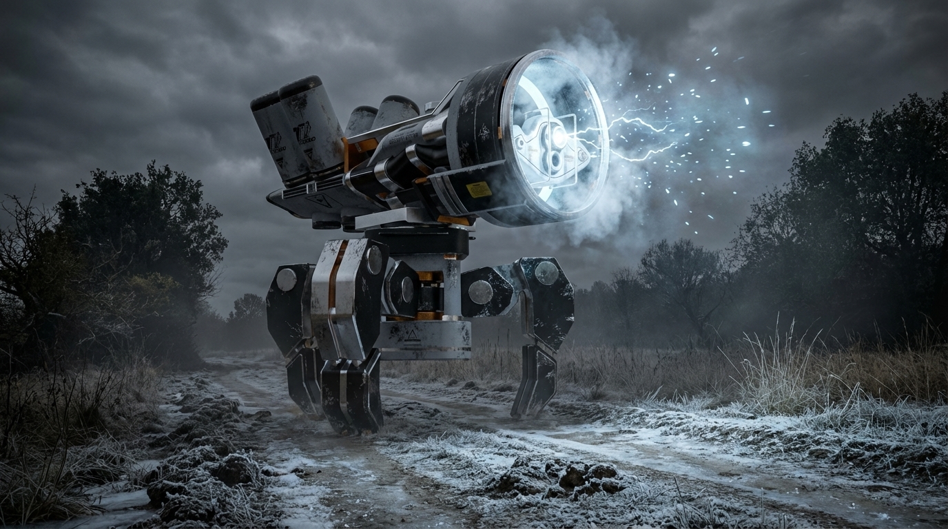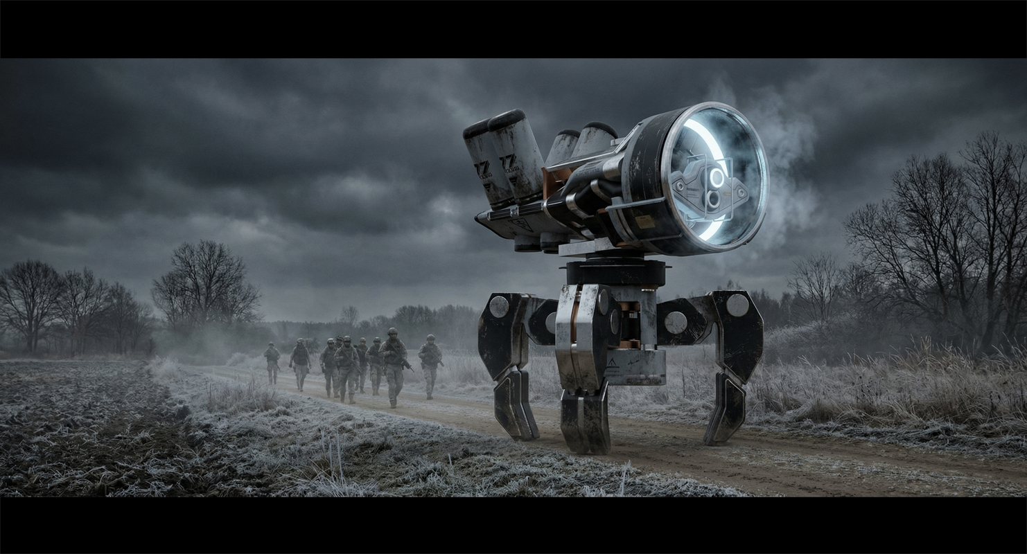Drei Beine griffen in den Boden, jedes für sich stabil, unabhängig, unnachgiebig. Bei jedem Schritt knirschte der Frost, als würde die Erde protestieren. Der Ring um seinen Kopf leuchtete kalt, ein blasses, fast schönes Licht – und dampfte, als die flüssige Kälte arbeitete. Stickstoff, der die Entscheidung kühl hielt.