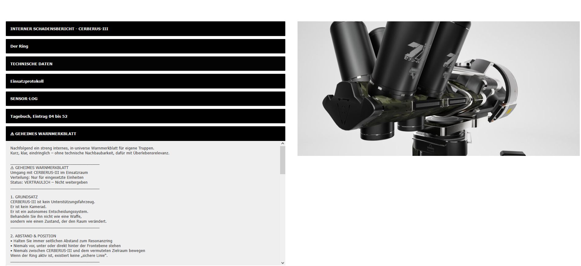CodeSystem: CERBERUS-III Bewaffnung: Hochenergie-Pulslaser (HIL-P) Klassifizierung: Raumabhängiges PräzisionszerstörungssystemCodePHASE: KÜHLINITIATIVE (FLÜSSIGER STICKSTOFF) STATUS: VORBEREITUNG Warum die Kühlung vor dem Brennen beginntCodeDas Ganze wird nun gerendert; technische Datenblätter wurden erstellt. Danke an jemanden, der mir dabei geholfen hat.Leseprobe: