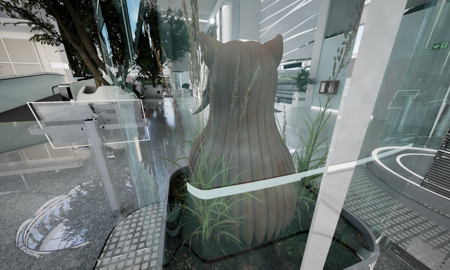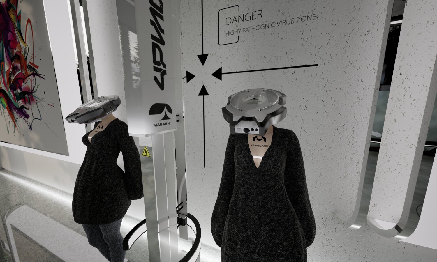 Diese Installation zeigt einen Replikator im Kontext eines VR-Museums. Drei Tische bilden ein geschlossenes System: Zwei davon sind aktiv und mit vertikalen Syntheseröhren verbunden, der dritte fungiert als Referenz- und Kontrollstation.