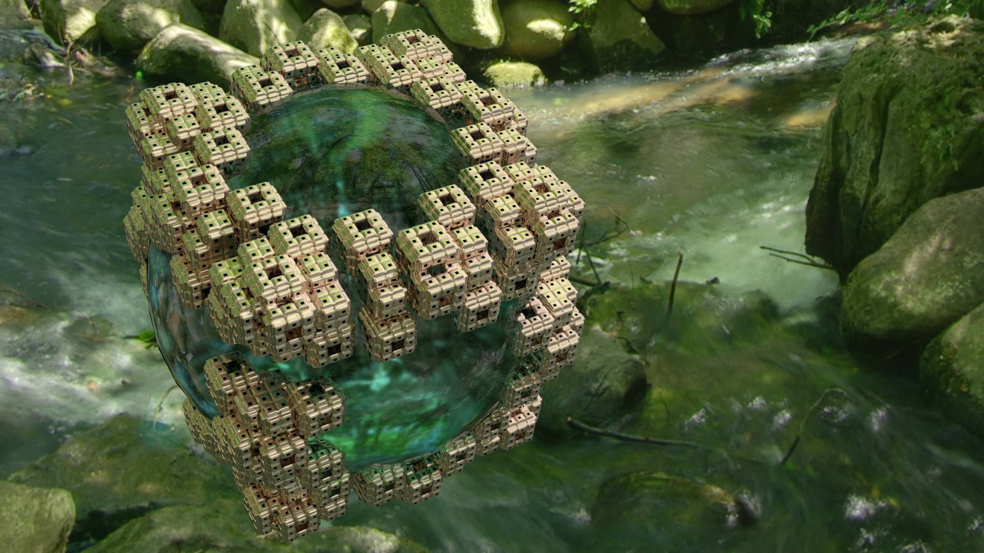 Zum Objekt-Import: Ich habe das Fraktal in Mandelbulb in eine Bildsequenz verwandelt und dann mit Hilfe von fiji und Meshlab in ein Objekt mit ca 99000 Tris verwandelt. Das Problem ist, daß die scharfen Kanten dabei verschwimmen, selbst wenn man nicht so stark reduziert, und die Kugel nicht wirklich rund und glatt ist. Kugel löschen und ersetzen geht auch nicht, weil alles ein Objekt ist und bei so vielen Polygonen wird man irre, wenn man versucht, die Kugel rauszulösen. Nachmodeln macht nur fast irre... ;)