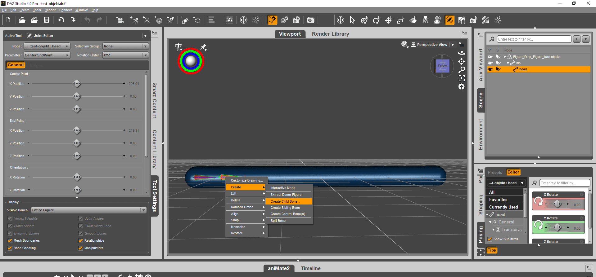 Naja, ich gehe in Poser aus Setup lösche alle gruppen und erstelle dann Knochen. 2 . stehe bone 1 ein und makiere dann die Fläche und wähle zum schluss Gruppe kombinieren und wenn ich beide bone so gemacht habe gehe ich wider auf posen, so dass ich alles sehe, kann dort die Figur bewegen und speichere sie ab, als figur und in DAZ wird sie dann auch angezeigt im Content, ein doppelklickt liefert nur die knochen.