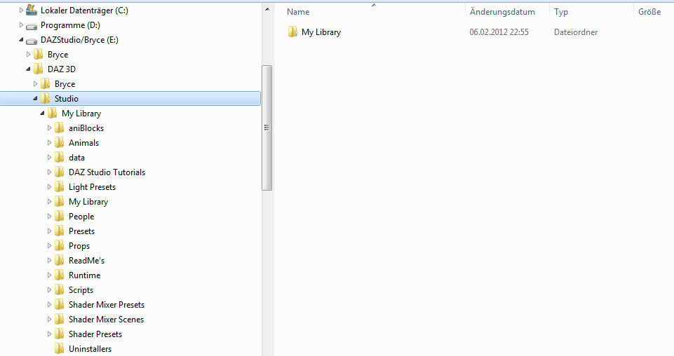 hier mal die komplette DAZ 4 Ordnerstruktur. Ich installiere grundsätzlich keine Progs auf C: , das ist eine Installation original ohne Änderungen auf LW E. Im Runtimeordner unter Libraries gibt es keinen Materialordner, den muß man selber anlegen, hab ich auch getan und der wird auch angezeigt.