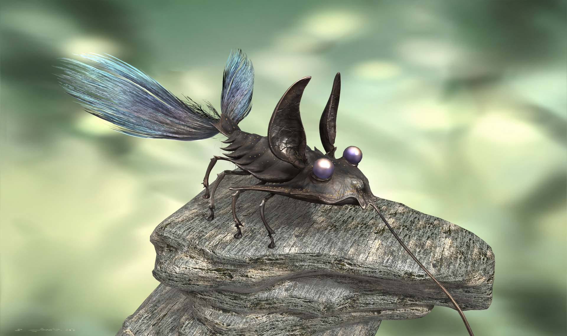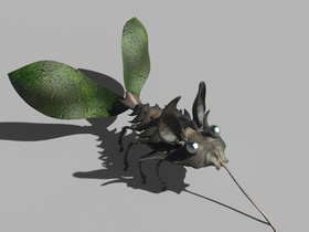 Bild 2 ist in Keyshot entstanden, das dauerte schon etwas länger, war aber auch High poly.Geknetet ist das Tierchen in Sculptris, die Feinarbeit ist in ZBrush gemacht und Die ganzen metalstruckturen und die Transparenz der Federn am Schwanz sind 3D Coat. Schabe 1 ist einfach mit Materialien von Keyshot belegt.