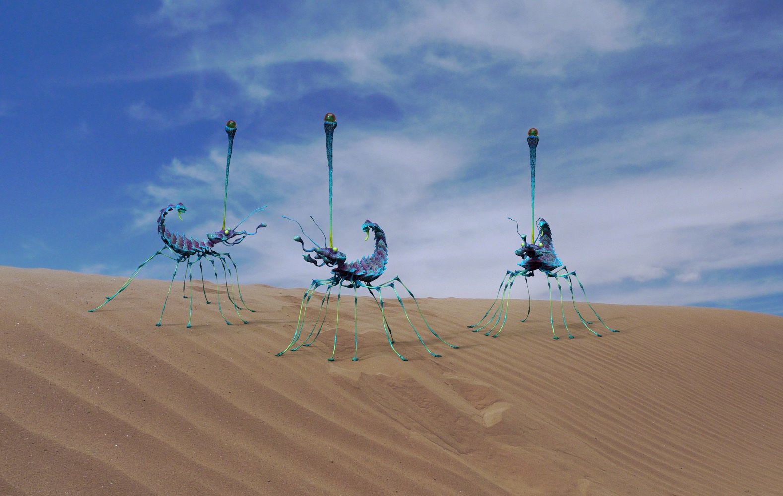 Nun mein nächster Bewohner Ari Moons an dem ich gerade arbeite: Der blaue Teleskopläufer. Die Tiere trotzen der Wüstenhitze im tiefen Sand vergraben, wo sie auch hervorragend vor Feinden geshcützt sind. mit ihrem Teleskopauge lauern sie auf unbedachte Beute, die sie äusserst flink erlegen. Teleskopläufer können auf kurzen Distanzen bis zu 75 Kmh schnell werden.