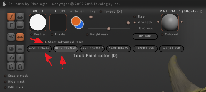 Hier kannst Du nun deine Maps importieren und exportieren. auch einen Screenshot kansst Du erstellen mit Export Psd. Denn kannst Du auch bemalen, mit import Psd projeziert Sculptris die Veränderungen dierekt auf dein Objekt.