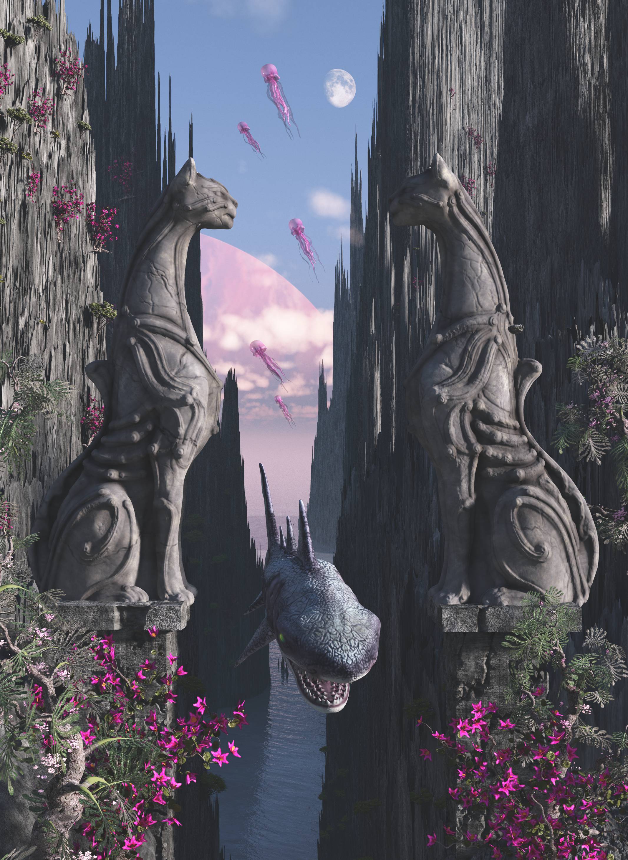 Zuerst hab ich mir eine Steinhoruskatze in ZBrush erstellt, dass sich mittlerweile gegen Vue ausnimmt wie ein zahmes Kätzchen. Dann hab ich mir einige Felsen erstellt, die ich eigentlich noch mit ein paar coolen Displacement Spalten verfeinern wollte. Leider sehen die doofen Spalten aber nur in der Materialvorschau cool aus, auf meinen Felsen schaut das Ganze aus wie ein Igel auf Speed, egal was ich auch verstelle.