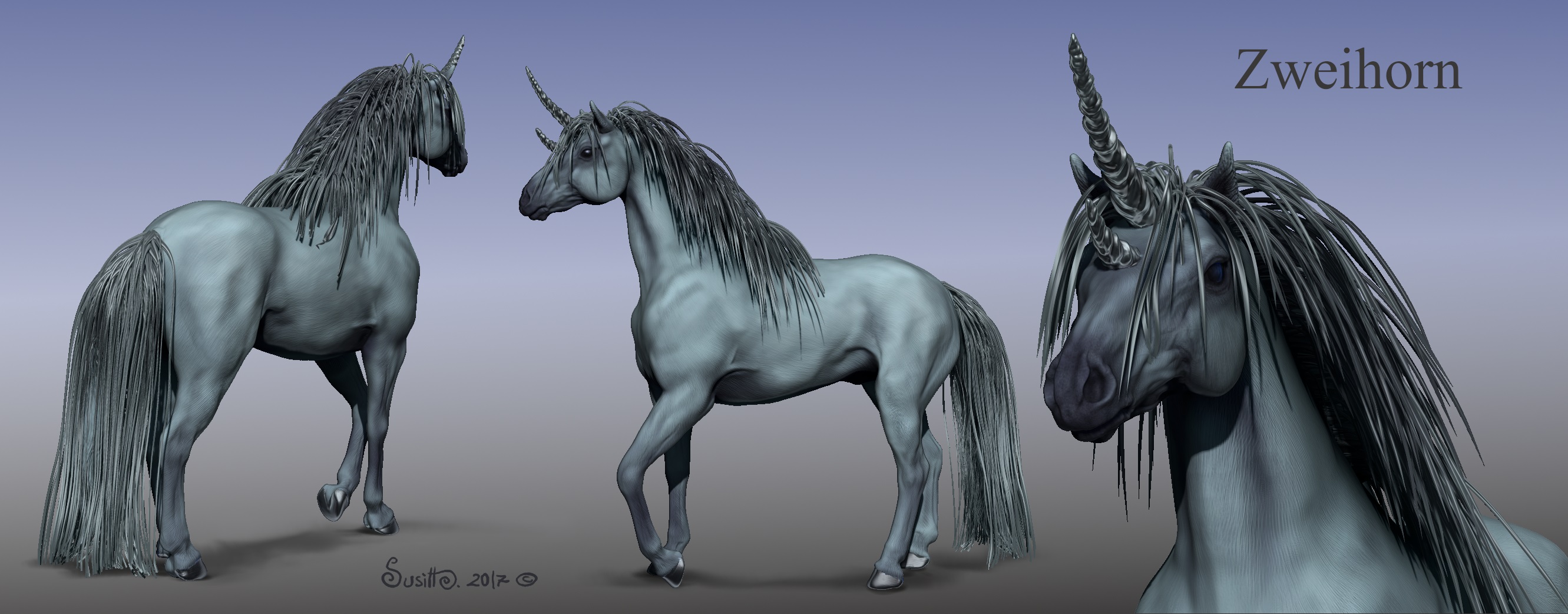 Danke an @esha, @Kyrla und @Cara für die nette Motivation und Hilfe! Ich bin immer glücklich zu hören, dass es noch andere Science Fiction Verrückte da draussen gibt. Nun hab ich nochmal eines meiner ersten Viecher aus der Mottenkiste geholt und fertiggestellt. Es ist ein Tier, das nicht so richtig nach Ari Moon passen will, aber vielleicht hat ja noch jemand Freude daran. Das Zweihorn stammt eher aus der Fantasy als aus der Science Fiction und deshalb hat es so lange bei mir auf Halde gelegen. Nun hab ich es doch noch fertig gemacht und trotz Fibermesh relativ Low Poly bekommen. Das Fibermesh hat sogar UVs