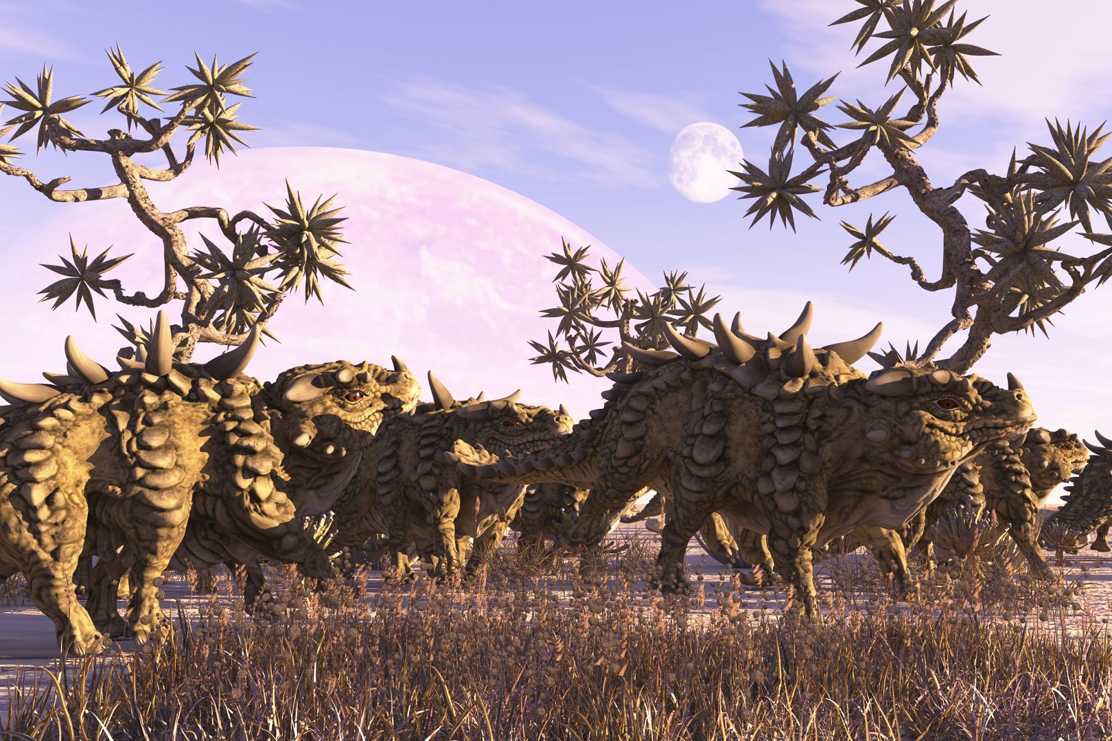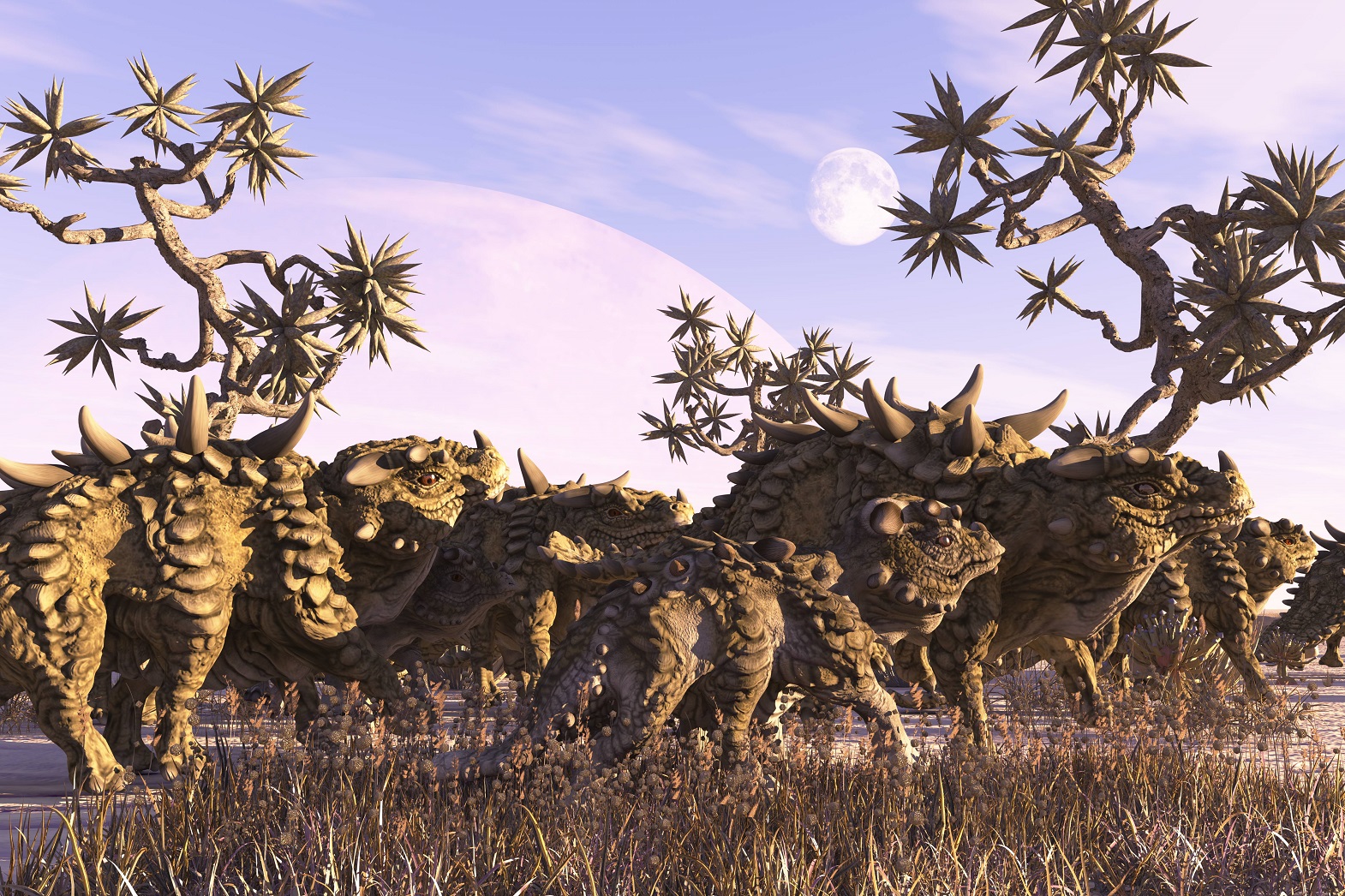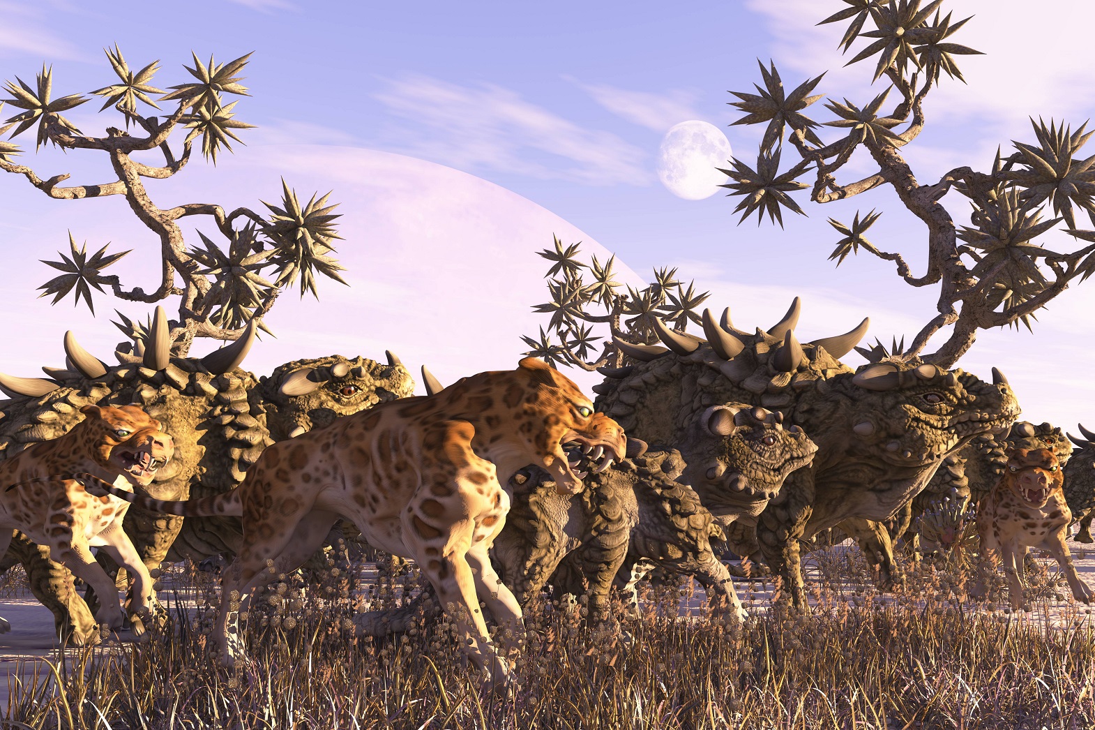 Ich habe vor, mit Vue eine Szene zu gestalten in der Räuber eine Herde Nahornechsen mit einem Kalb von der Seite aus angreifen. Das ganze natürlich in der Savannenlandschaft der Etocha Planes. Da werde ich aber noch einiges zu kneten und auch einige (für mich) komplizierte Probleme zu lösen haben, die mir jetzt schon Kopfschmetzen bereiten. Möglicherweise werd ich um die Sache mit den Bones nicht mehr herumkommen..