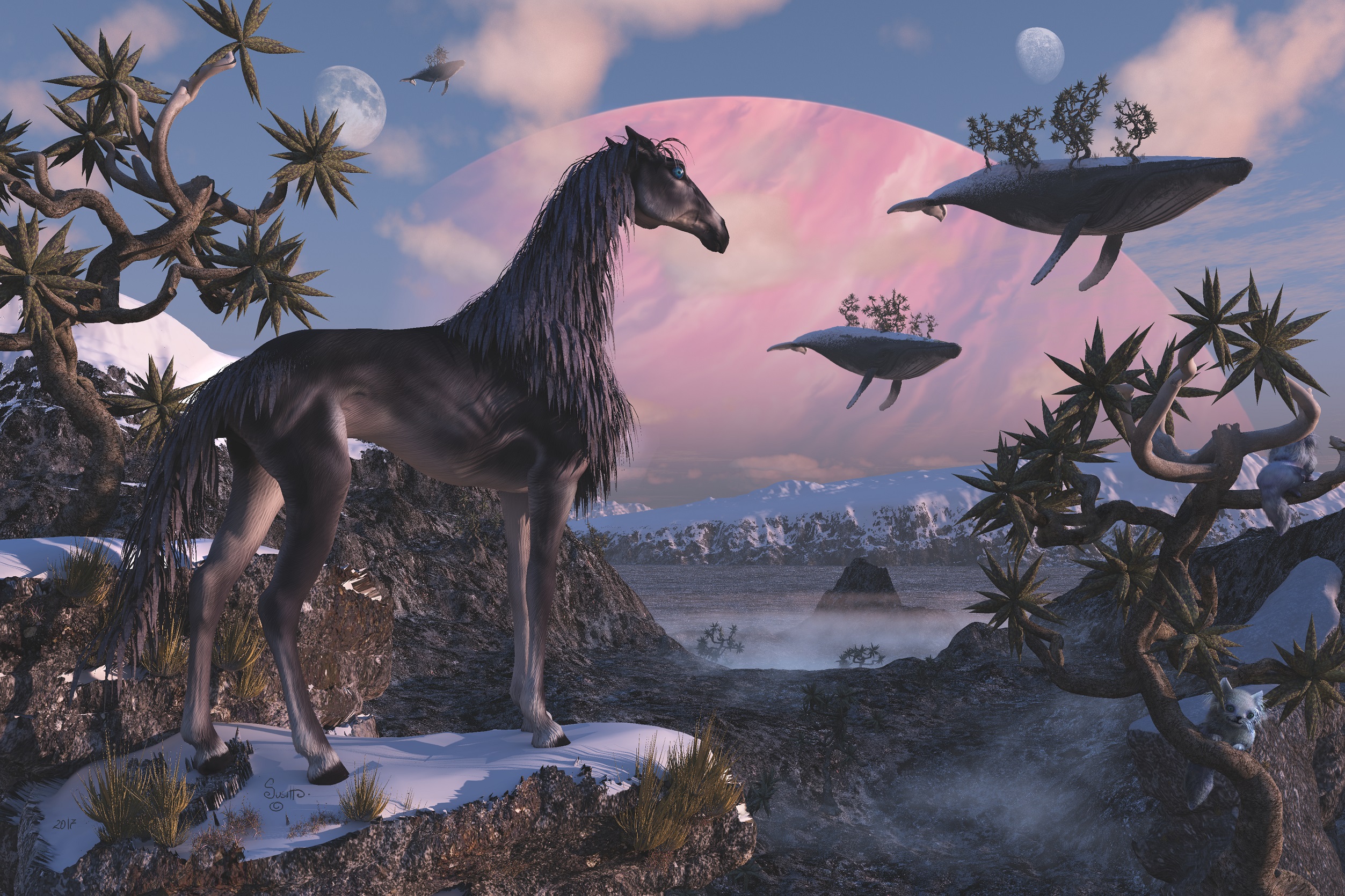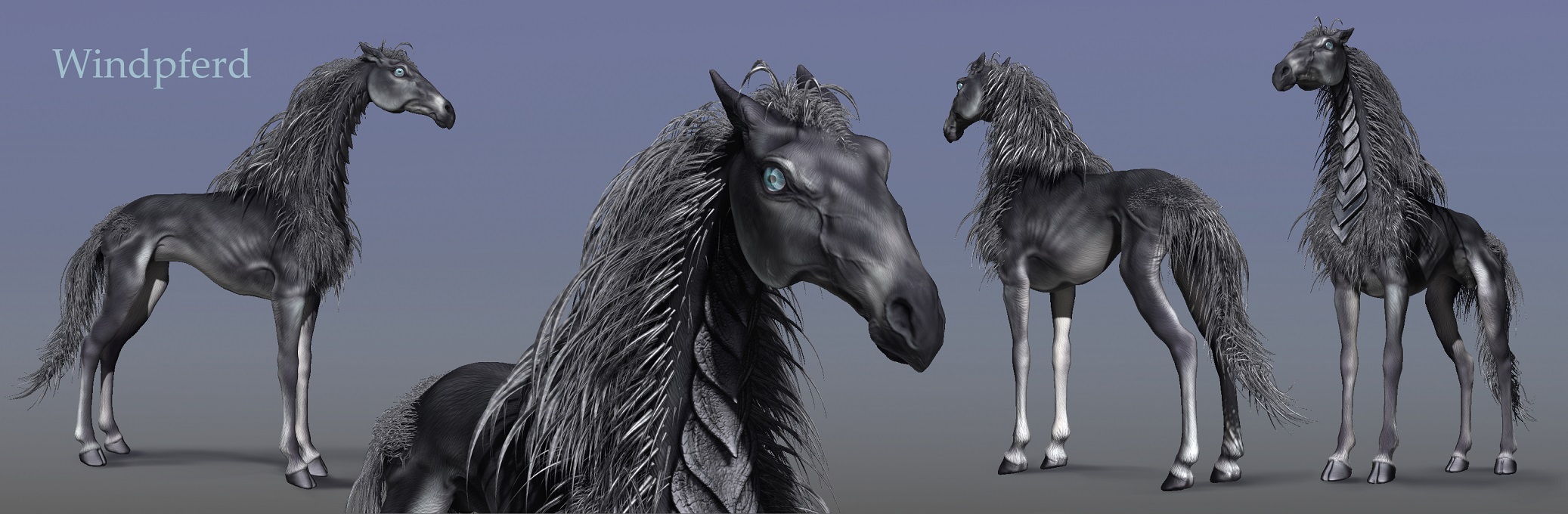 Nun hab ich mein Auswilderungsprojekt erfolgreich abgeschlossen. Mein Windpferd hat sich in der eisigen Landschaft der Death Horse Mountains in New Sweden gut eingelebt und betrachtet majestätisch seinen neuen Lebensraum. damit es nicht so alleine ist, hab ich ihm noch zwei Eishörnchen zur Seite gestellt. Diese kleinen Räuber ernähren sich von Polarmäusen (muß ich noch kneten) und anderen kleinen Bewohnern der Polregion. Ich habe leider die Eishörnchen nicht richtig in Vue realisieren können, da das Fibermesh beim Rendern EWIG braucht ?!?. Deshalb hab ich sie ohne Fibermesh eingesetzt und dann nochmal in ZBrush gerendert und darüber gelegt. Ein Riesenaufwand für so kleine Viecher..