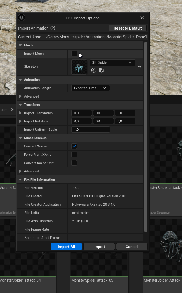 Wenn Du das Skeletal mesh noch nicht importiert hast, musst du natürlich dieses mit importieren.