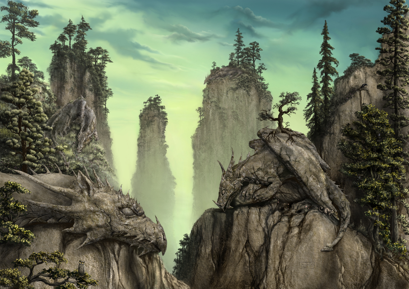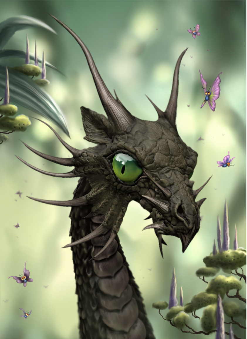Hier noch einige weitere Mitglieder meines Zoos:Die steinernen Drachen sind mit Sculptris entstanden, der Rest ist Gimp. Es war gar nicht so leicht, das Ganze so einzubauen, das es wie ein homogenes, gemaltes Bild wirkt, und nicht wie eine Collage. ich glaube es ist mir einigermassen gelungen. Es hat etwas länger gedauert, als wenn ich alles mit Gimp gemalt hätte, aber dafür hat es noch mehr Spaß gemacht.