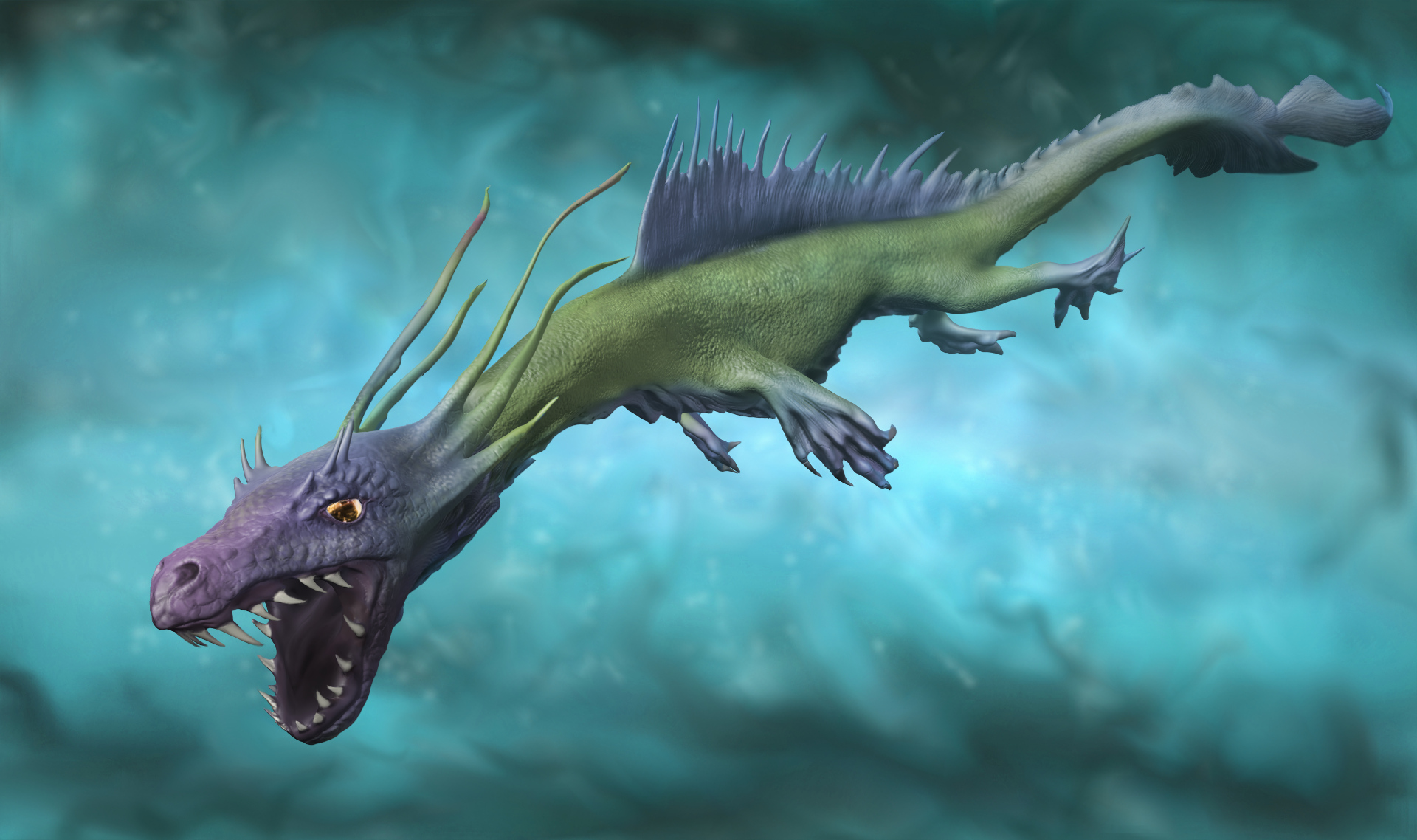 Hier noch ein Tier, wärend ich gerade darauf warte, dass sich mein Computer an meiner neuesten Kreation totrechnet:Na also, ein Meerdrache