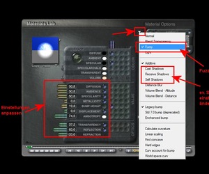 Das Material muss unbedingt auf "Fuzzy" gestellt werden, sonst sieht man die Schnittfläche. Dann ev. die Schatteneinstellungen aus dem Material herausnehmen. Transparenz anpassen und hochsetzen, ebenso Reflektion und die anderen Werte. Das kann man ja, so wie man es braucht einstellen. Einfach probieren. -