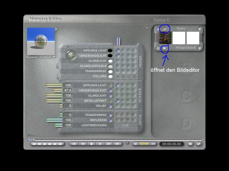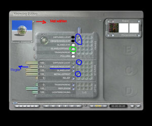 Dann wählst du wieder die Ansicht Regisseur, erstellst ein Radiallicht, damit es hell in der Kugel ist und du was siehst. Dann markierst du wieder deine Kugel. Gibst ihr aus der Rubrik "Metalle" das Mat. "Gebürstetes Zinn" . Im Mateditor setzt du eine lila Kugel unter Textur A für die Farbe in Diffuses und Umgebungslicht, für die Stärke in Diffuses Licht und Metalleffekt. Je nach dem, wie es wirken soll, muss jetzt die Stärke für das Umgebungslicht eingestellt werden, dazu unter Stärke an dem Regler für Umgebungslicht ziehen.
