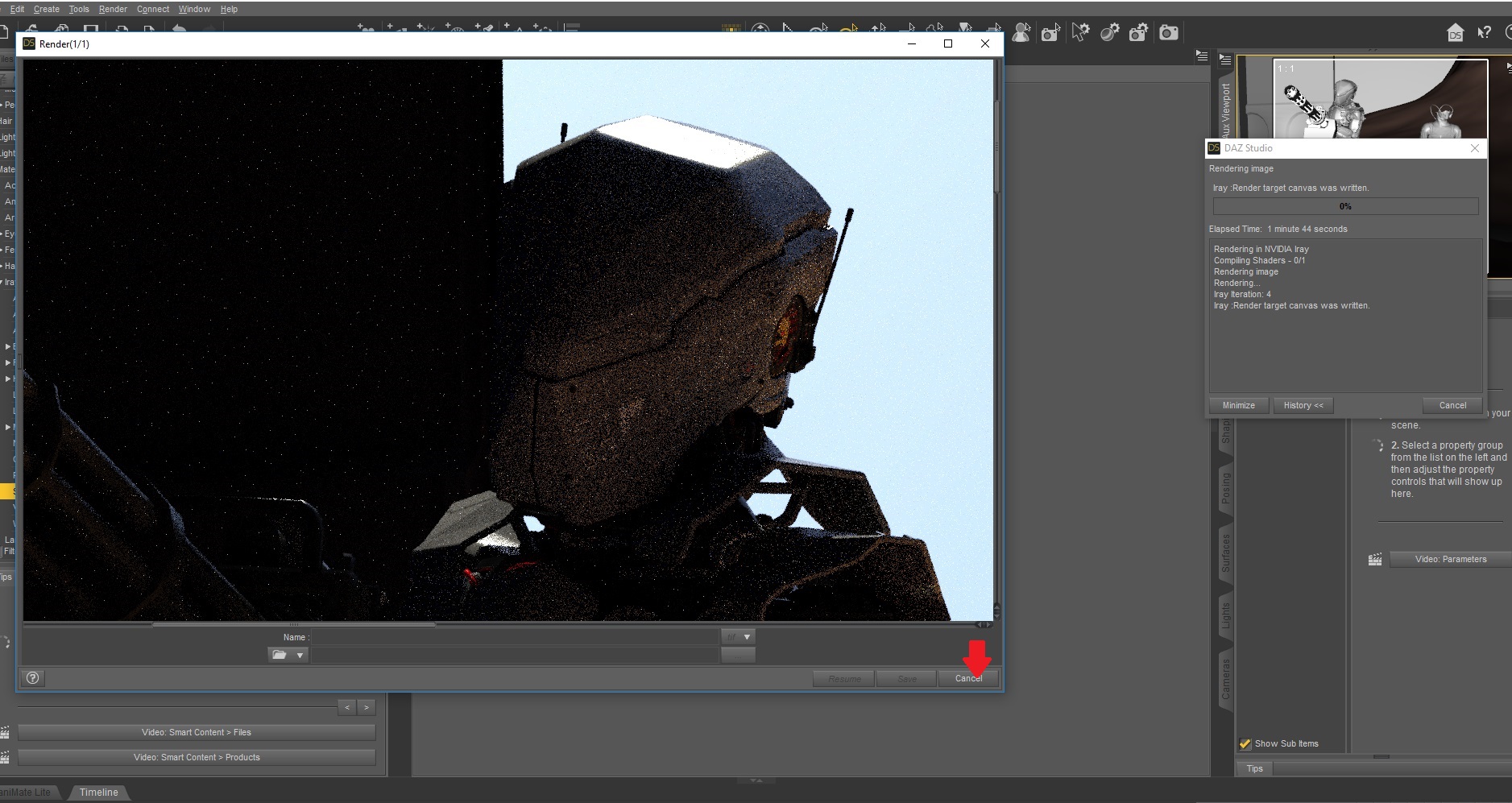 Dann im Fenster des Renders auf Cancel Klicken. Nicht im Log Fenster dann funktioniert es nicht! -->tut 3