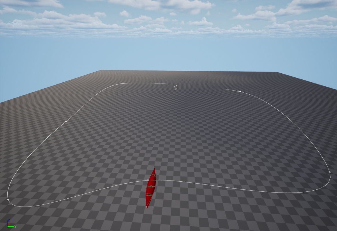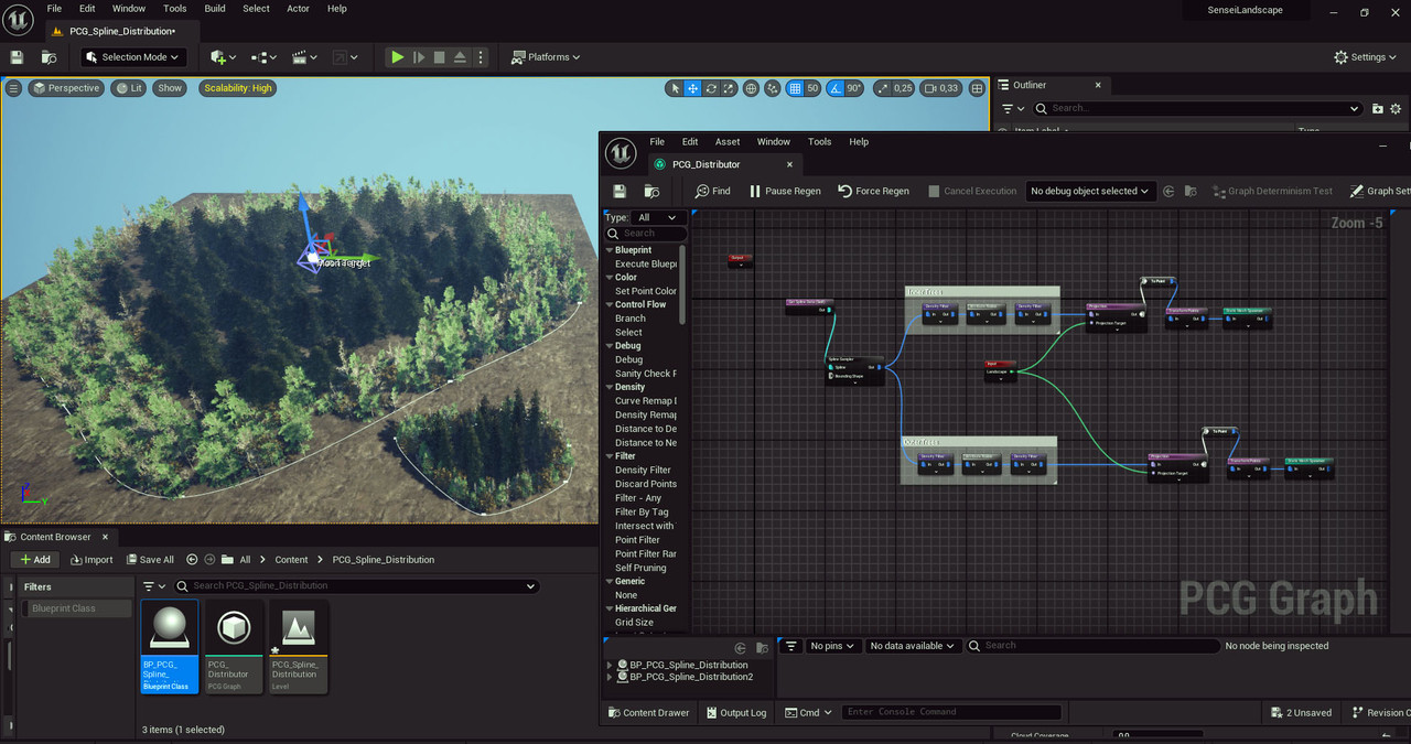 Das geniale daran ist. Man packt einfach den Blueprint(unten links blau) auf sein Terrain und verschiebt die Punkte des Splines wie man will. Den Rest macht die Funktion(rechts).