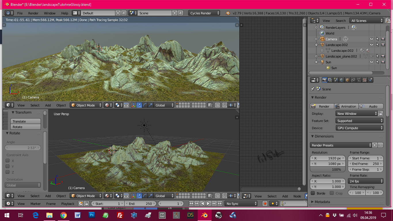 Sooo, hier präsentiere ich euch nun mal mein Anfangswerk mit Blender. Terrain mit dem Landschaftsgenerator, dynamische Textur dafür nach Tut selbst erstellt, Background HDRI und bisserl Mist rein gebastelt auch nach Tut
