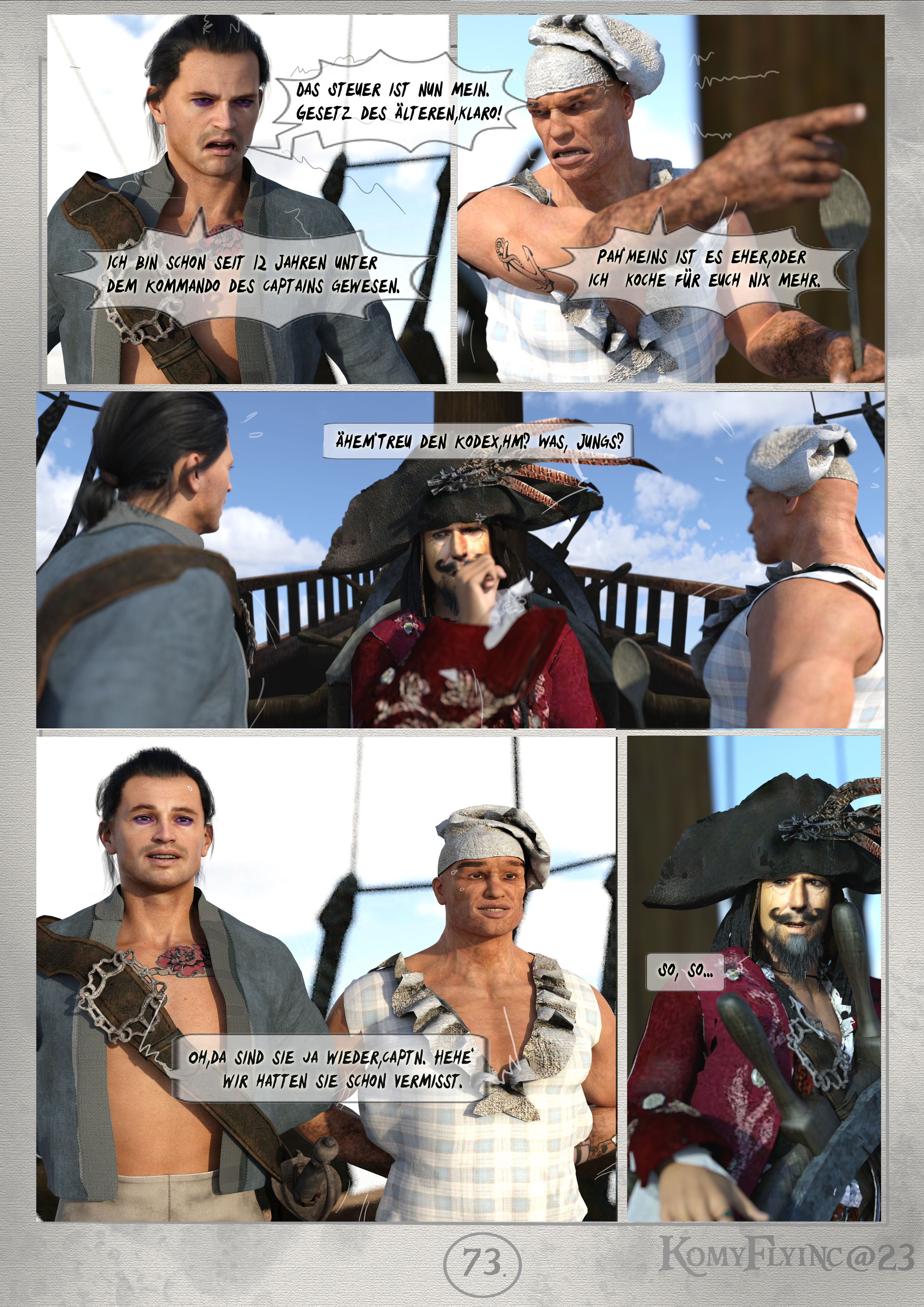 T.S lauscht seiner Crew,die draußen hadert -schließlich hat ihr Captain sich lange nicht mehr blicken gelassen und es werden schon erste Ansprüche ans Steuerrad genommen.