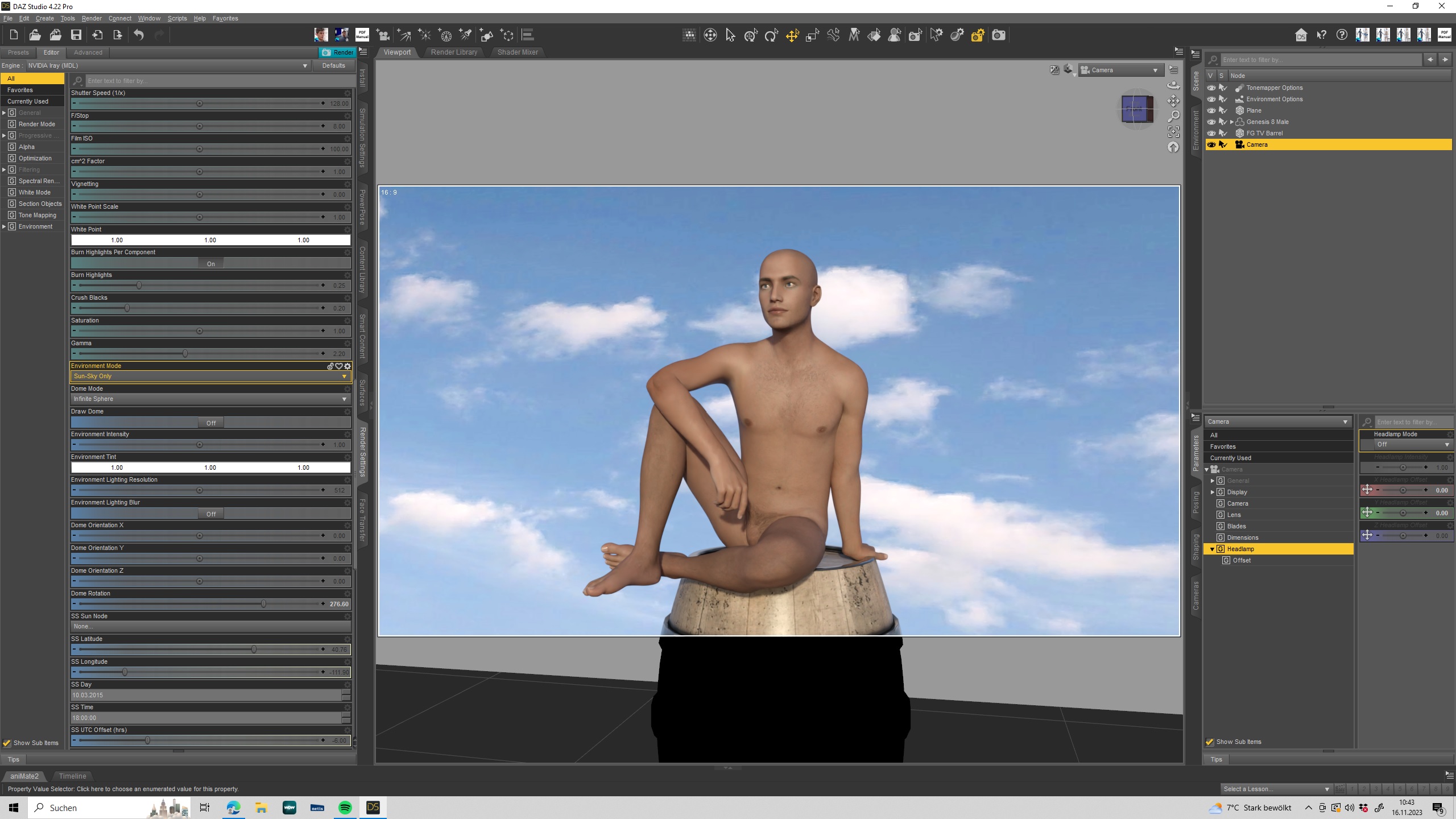 Aha,,,,HDRi Skydomes verputzen schon alleine eine MEEEENGE Arbeitspeicher ,dementsprechend arbeite eher mit einer Plane (reicht völlig für den Hintergrund bei bebilderten Geschichten)
