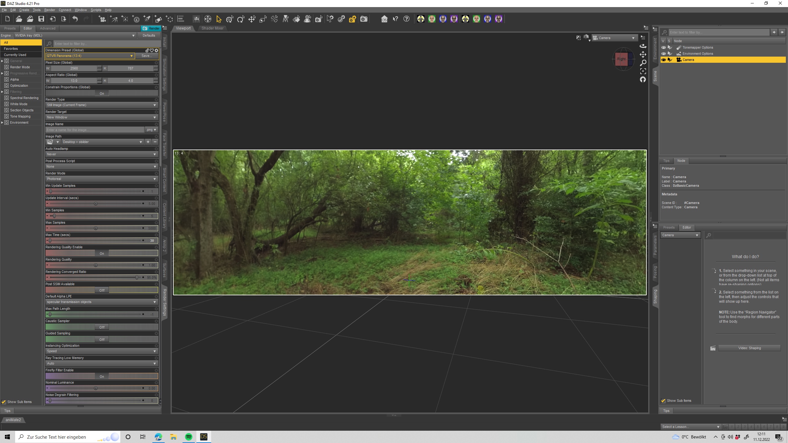 Wir aktivieren im Rendersetting ,die Kamera bzw die View . in dem Fall,habe ich auf Panorama umgestellt für einen längeren Kamera Blick^^