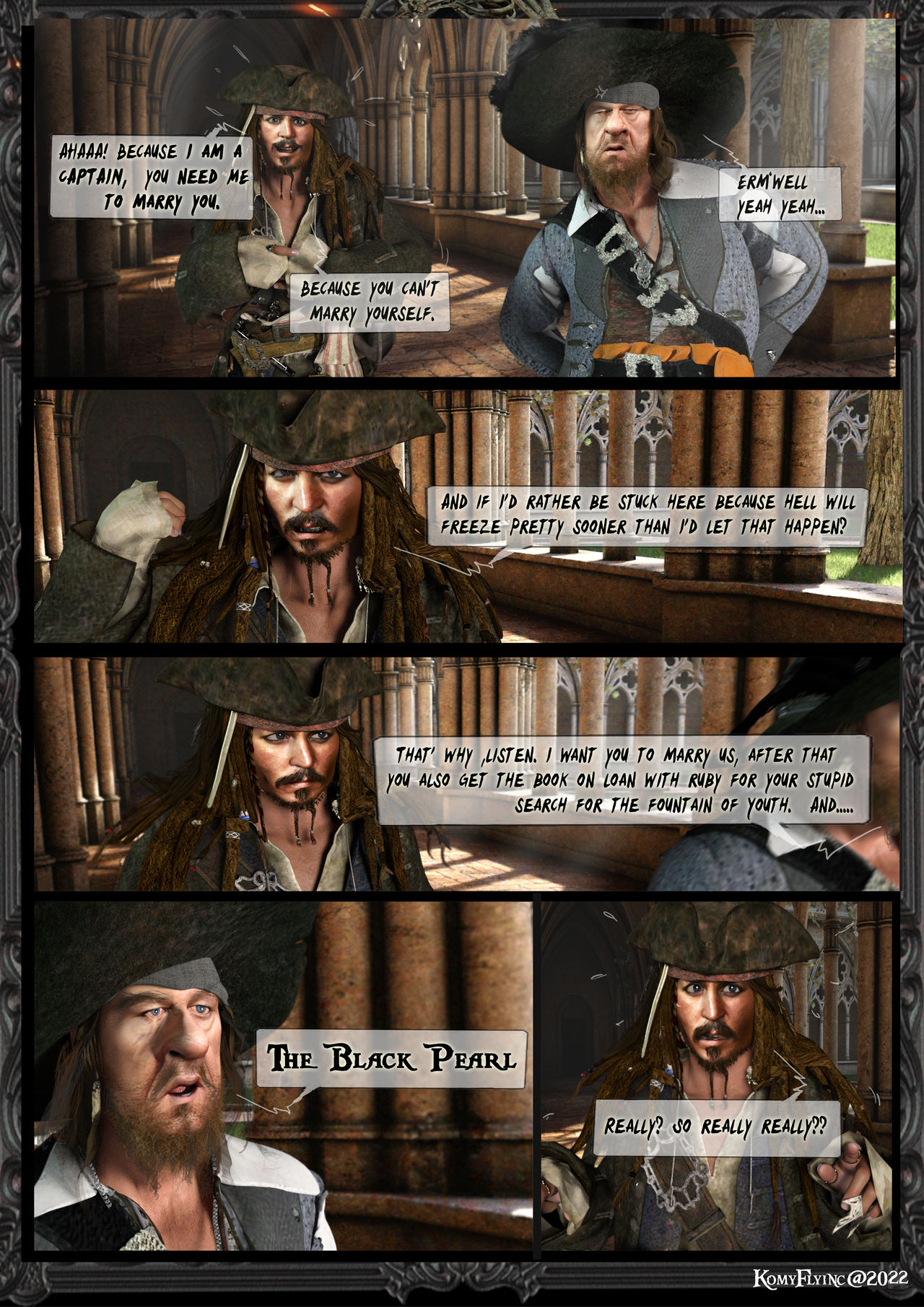 Jack erhellt sich strahlend: AHAAA! Weil ich ein KAPTAIN bin, du brauchst MICH für die Heirat. Weil du dich nicht selber verheiraten kannst.