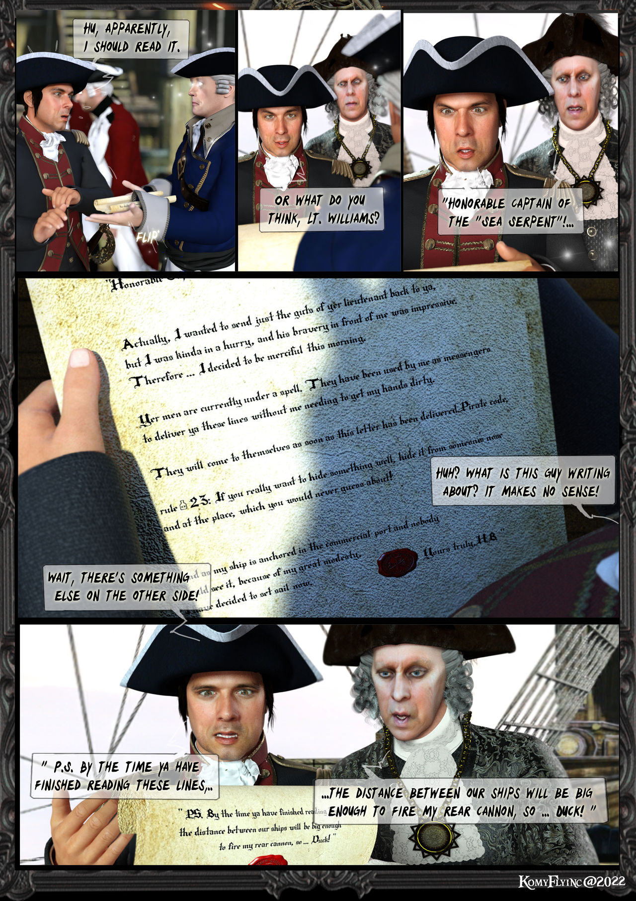 Es ist ein Brief,der mit schnörkeliger Schrift , folgendes beinhaltet. Laut liest Captain Benbow vor.