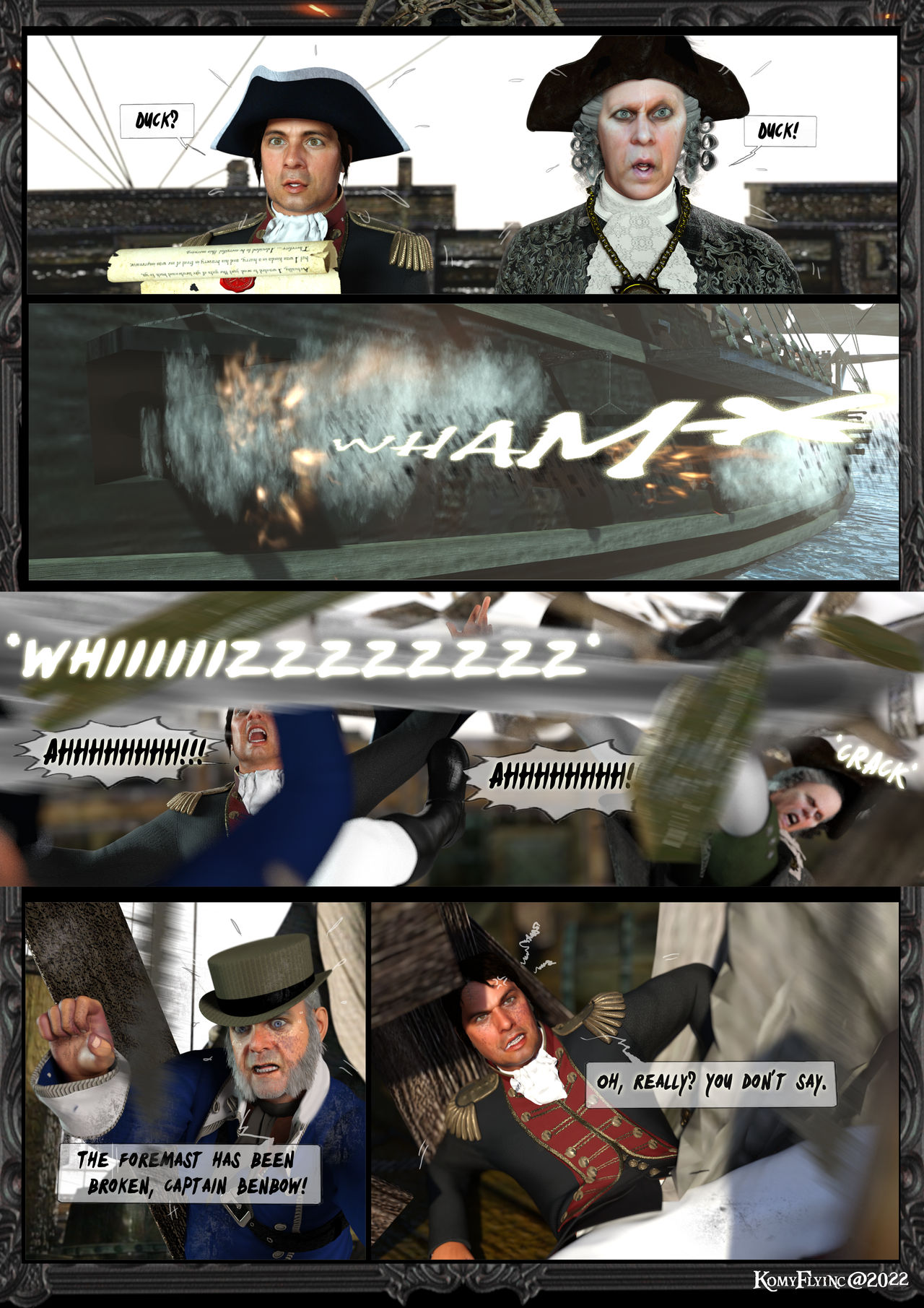 Und eine Kanonen Kugel fliegt rasend schnell an den Köpfen nah vorbei ,vorbei auch an Gibbs mit knapper Not.